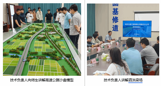 活动伊始,在SS-3标项目经理部技术负责人的引导下,实践团首先聚焦会议室的高速公路沙盘模型。该模型精准还原了盐洛高速宿城至泗洪段的线路走向、桥梁枢纽布局及沿线生态保护区域,直观呈现了项目“串联区域经济、服务民生出行”的核心价值。技术负责人围绕项目总体规划、关键控制性工程及建成后对宿迁地区“完善交通路网、带动产业协同”的战略意义展开细致讲解,帮助师生们快速建立对工程的全局认知,为后续实地观摩奠定基础。