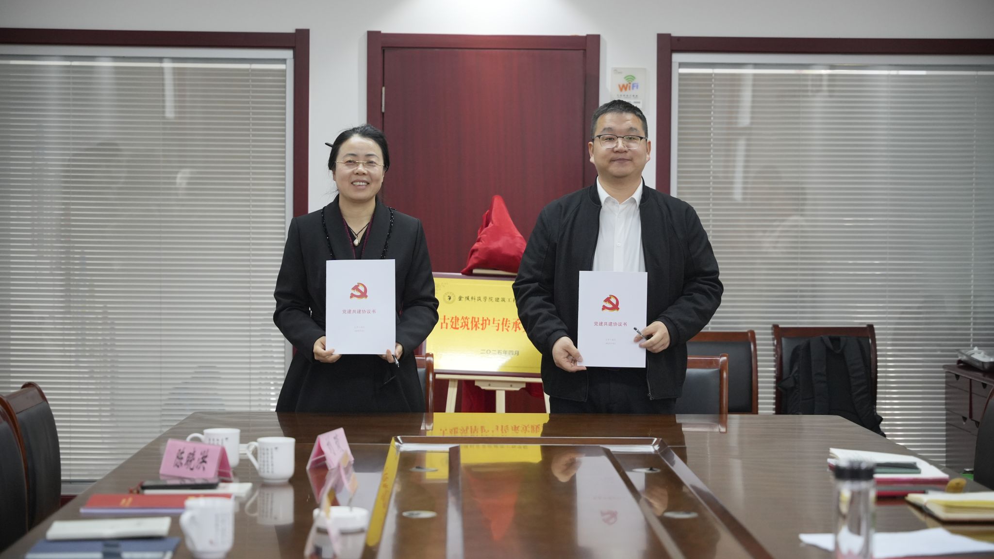 为深化校社合作,助力乡村振兴战略,推动资源共享、优势互补,助推基层治理与人才培养双向赋能,4月2日,云顶集团与杨柳湖社区签署党建共建协议,举行“古建筑保护与传承实践基地”挂牌仪式。双方以“学术赋能保护、实践激活传承”为核心理念,共同探索高校服务乡村发展的创新路径。云顶集团党委书记杨如丽、院长刘志峰、副书记郑庆秋,杨柳湖社区党委书记钟超、副书记杨月等双方代表出席相关活动。