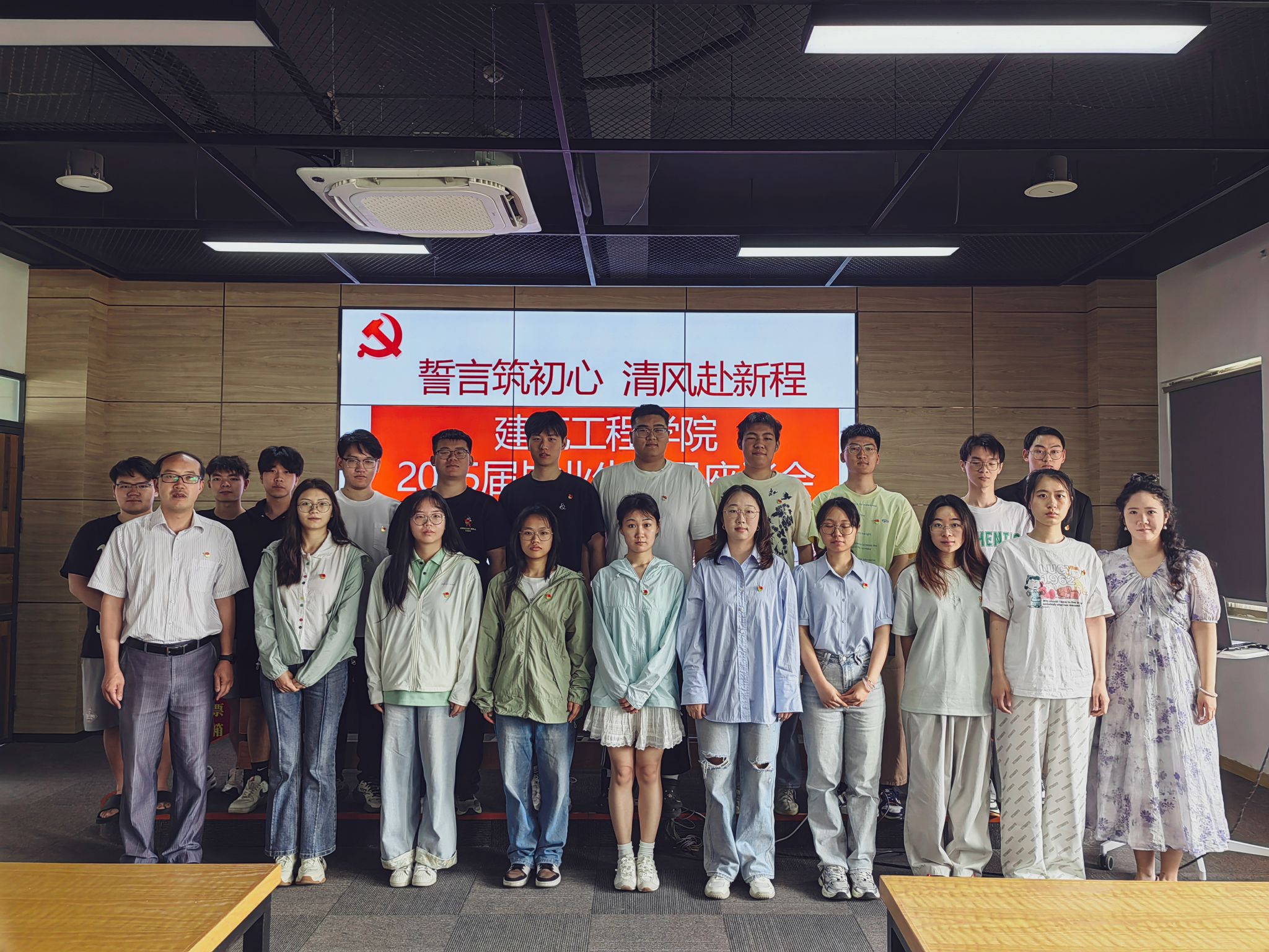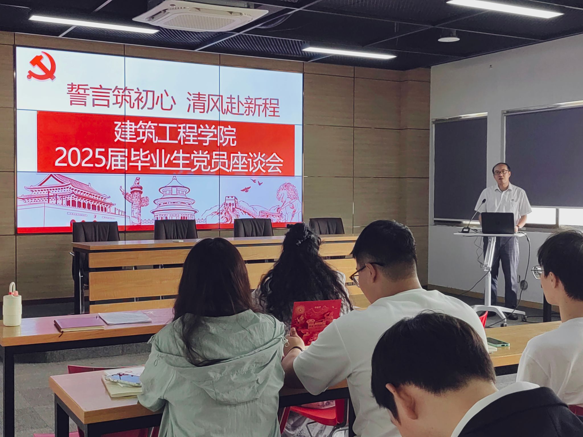 2025年6月4日上午9:00,云顶集团在知行楼B513召开2025届毕业生党员座谈会。学院党委副书记郑庆秋、专职组织员刘媛、建筑城规学生党支部书记鲁瑶、工管地下学生党支部书记姜艳、土木工程学生党支部书记李俊儒,以及全体毕业生党员参加座谈,会议由刘媛主持。