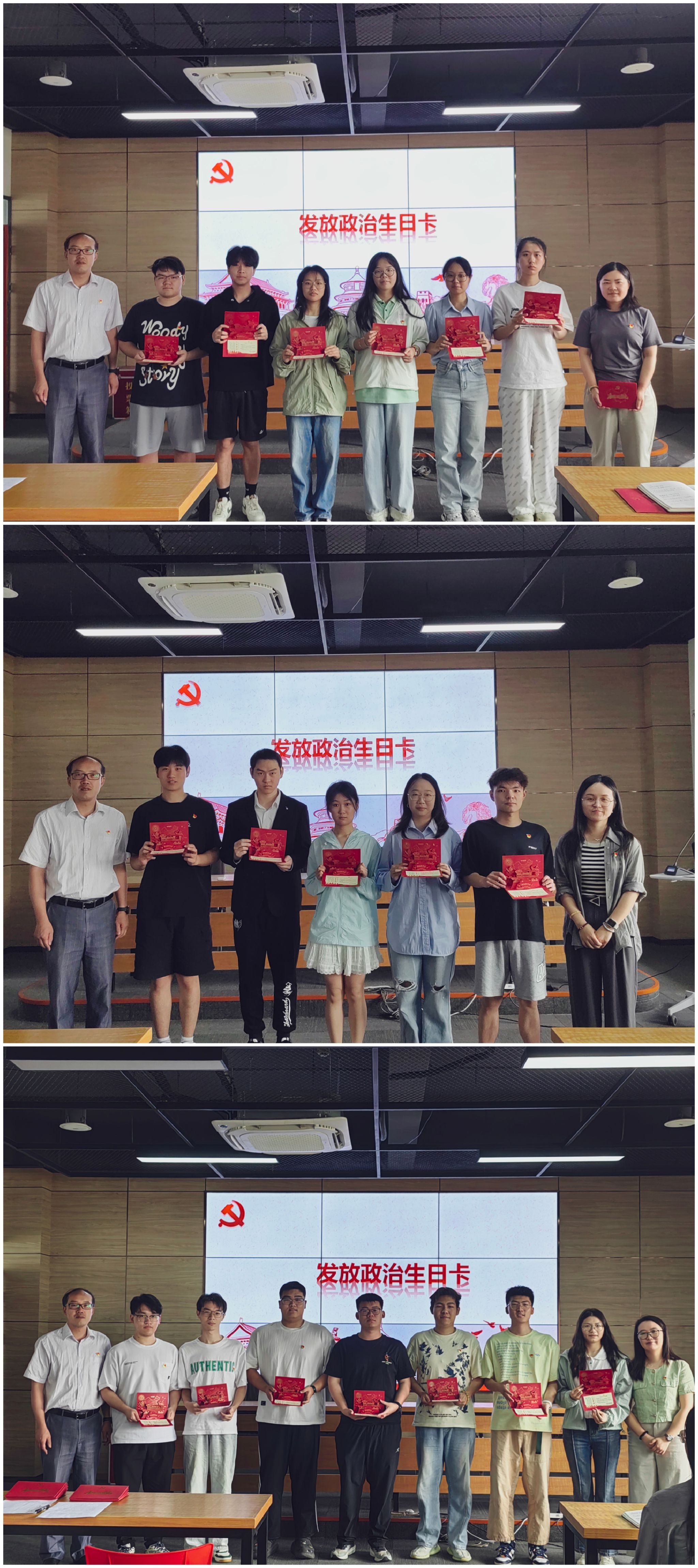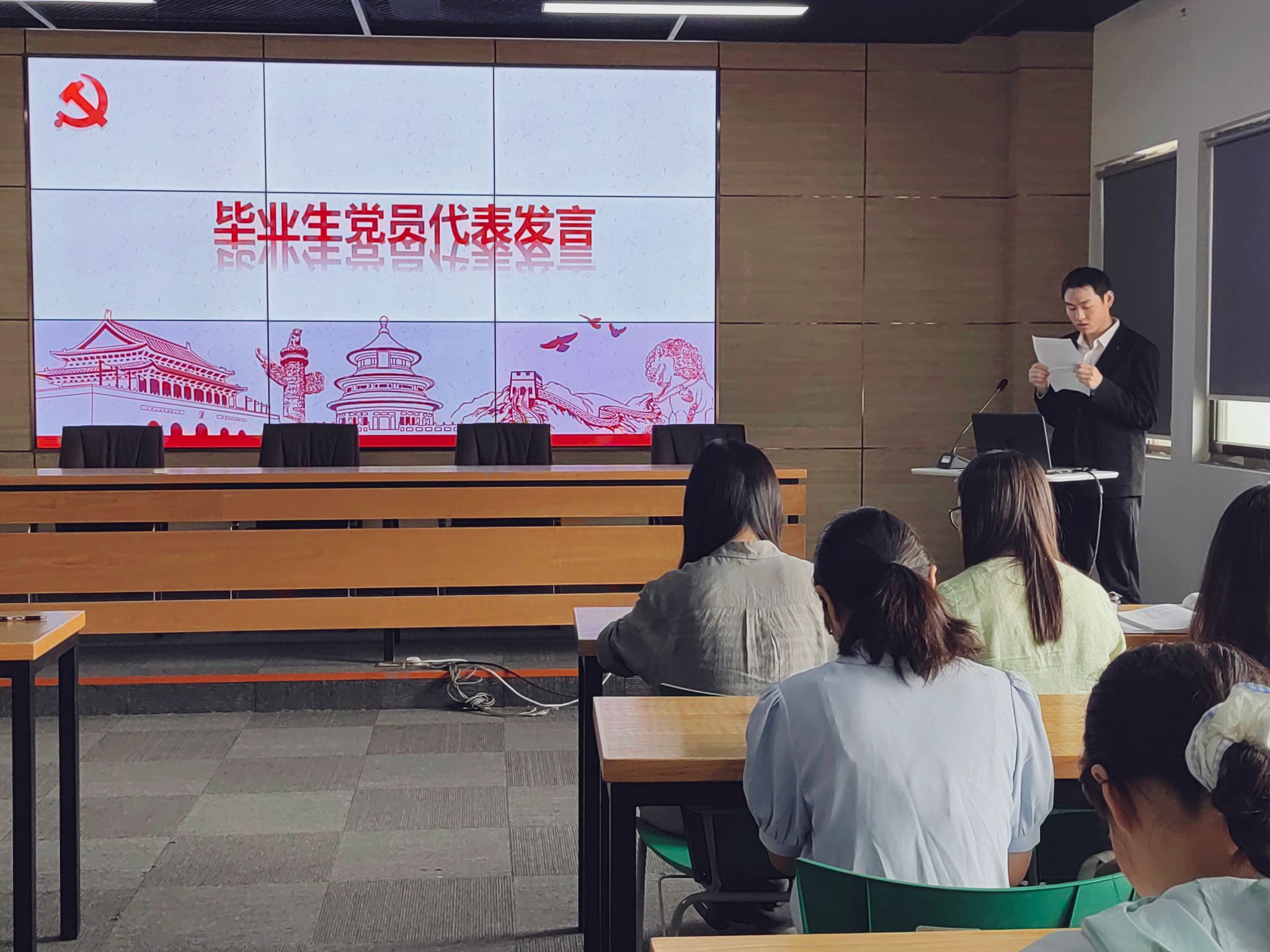 各学生党支部书记为毕业生党员发放了政治生日卡,希望各位毕业班党员不忘入党初心、牢记责任使命,在今后的人生道路上更加勤勉自立,发挥党员的作用,做出更大贡献。党委副书记郑庆秋为大家上了大学期间最后一次党课,他围绕“不忘来时路、奋进新征程、担当新使命”三个维度,带领大家共同回顾过往、审视当下、展望未来,激励大家以更加坚定的理想信念、更加纯粹的党性修养、更加昂扬的奋斗姿态,投身于全面建设社会主义现代化国家的伟大实践。他深情表示,母校永远是大家最坚强的后盾和最温暖的家园,期待大家常回母校看看,共叙师生情谊。