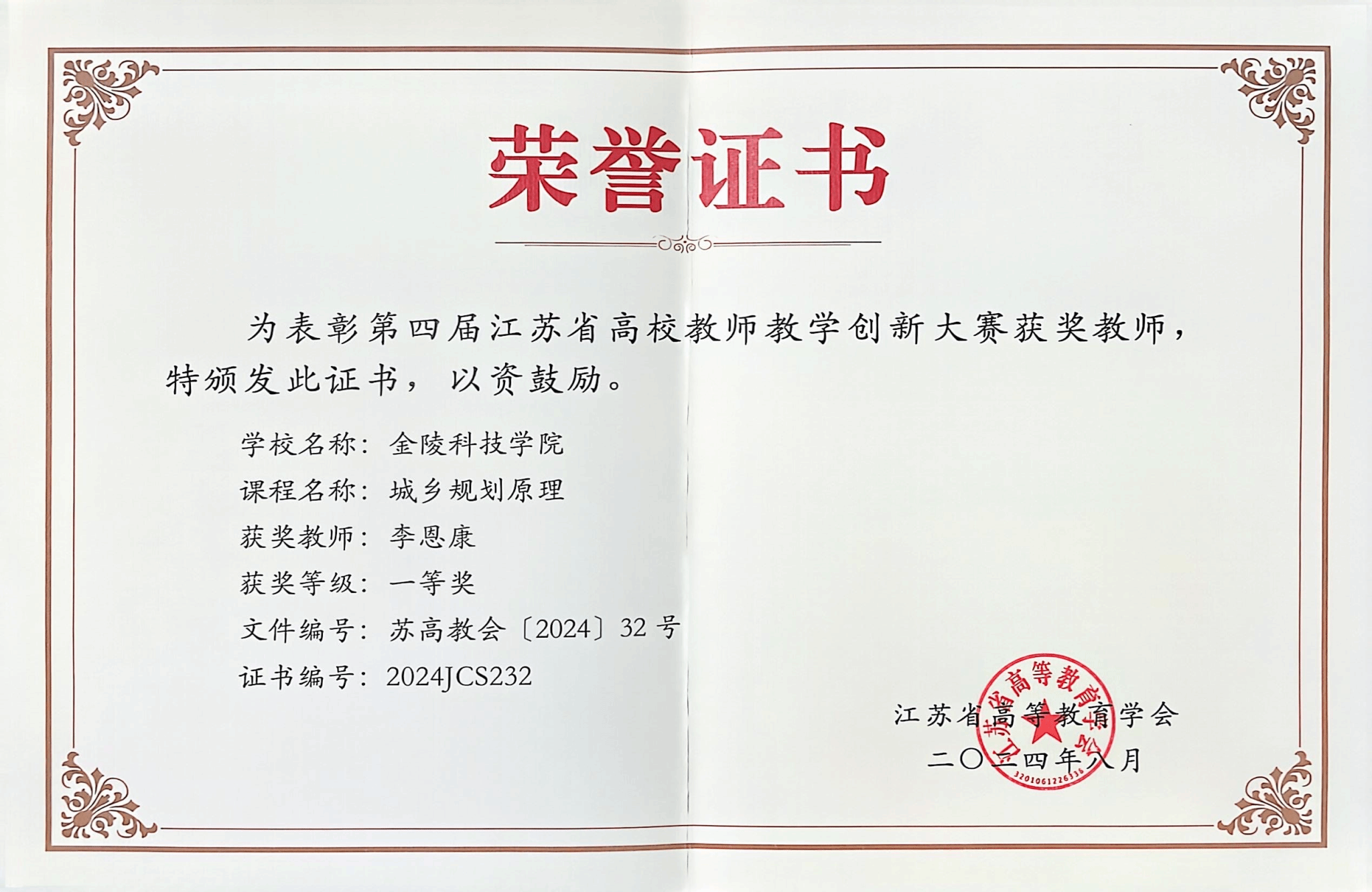 2024年7月17日,江苏省高等教育学会正式公布评审结果(苏高教会〔2024〕32号文),我院李恩康老师在2024年7月7日举办的第四届江苏省高校教师教学创新大赛中荣获新教师赛道一等奖。