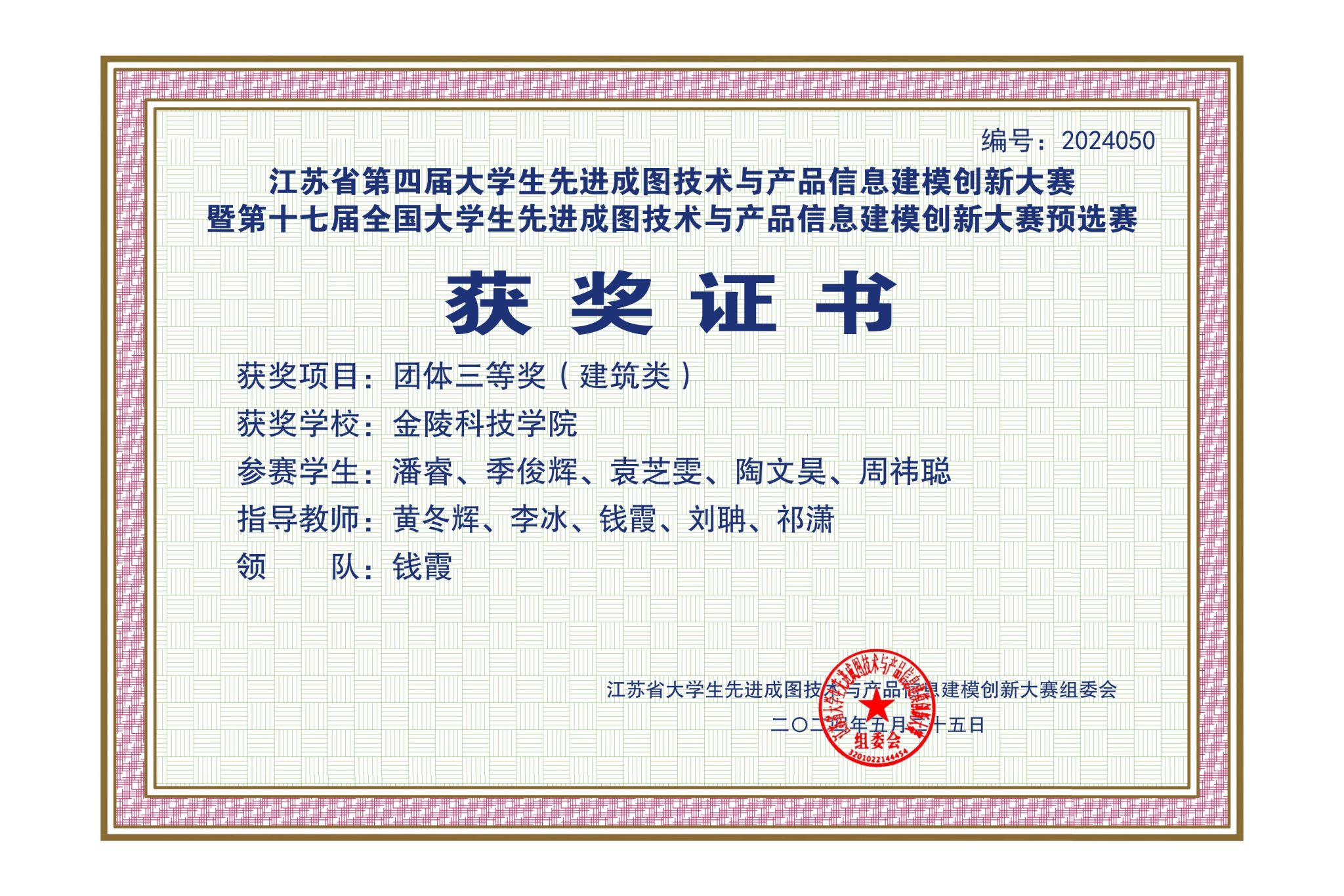 2024年5月25日,江苏省第四届大学生先进成图技术与产品信息建模创新大赛暨第十七届全国大学生先进成图技术与产品信息建模创新大赛成功举办。经过激烈角逐,我院土木工程专业潘睿同学获建筑类个人二等奖,建筑学专业季俊辉同学获建筑类个人三等奖,潘睿、季俊辉、袁芝雯、陶文昊、周祎聪5位同学获得建筑类团体三等奖的好成绩。