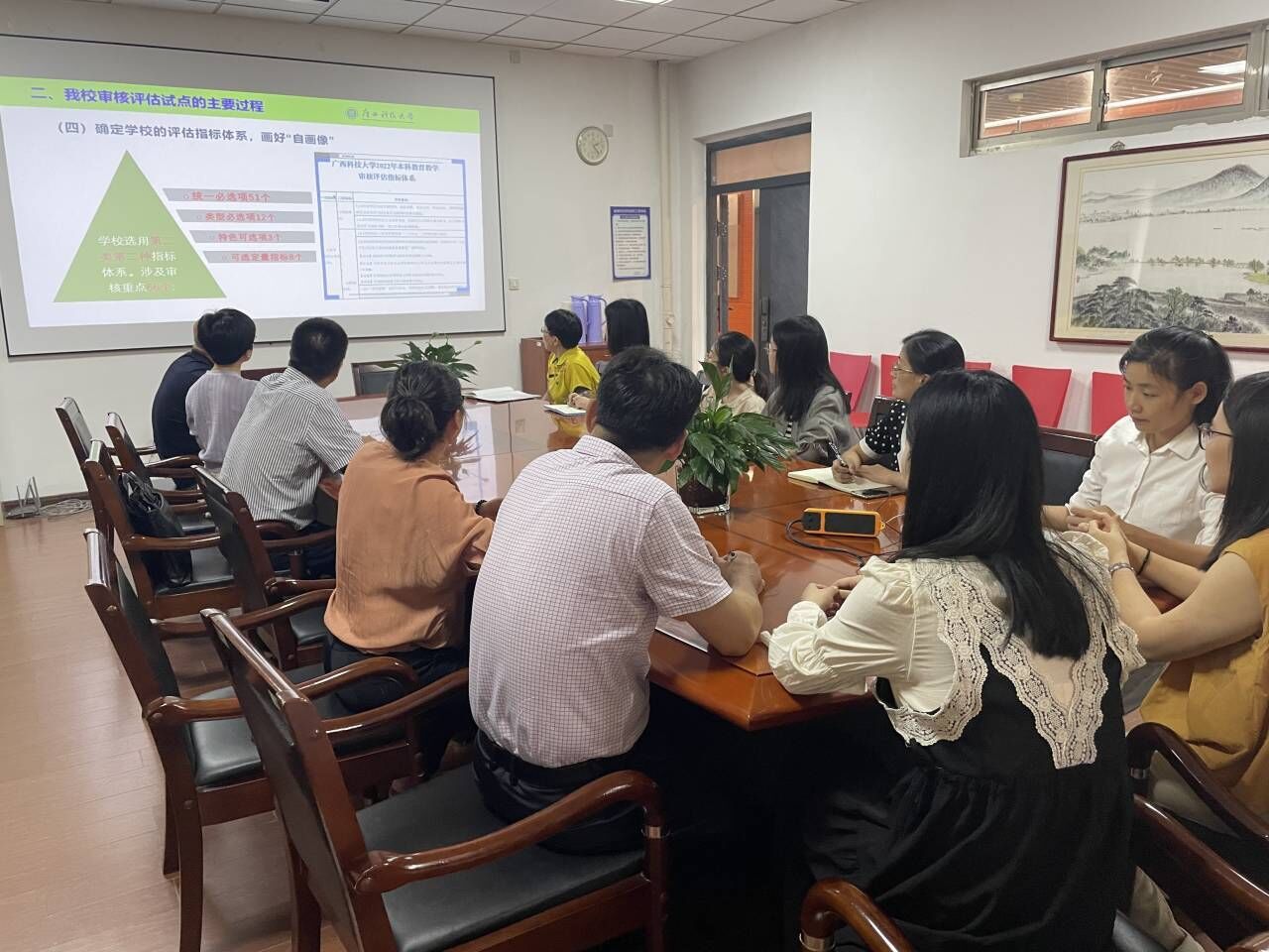 会议邀请了广西科技大学教育评价中心秦福利主任对审核评估整体工作做了全面阐述和说明。主要从全面把握新一轮审核评估的主要精神;立足校情,扎实做好评建工作;评估收获与体会三个方面进行了讲述。具体评建工作包括开展学习培训;做好顶层设计;开展评建工作;填好两个数据库;撰写自评报告,准备案头材料;做好线上、线下评估(迎评)工作等六个方面内容。