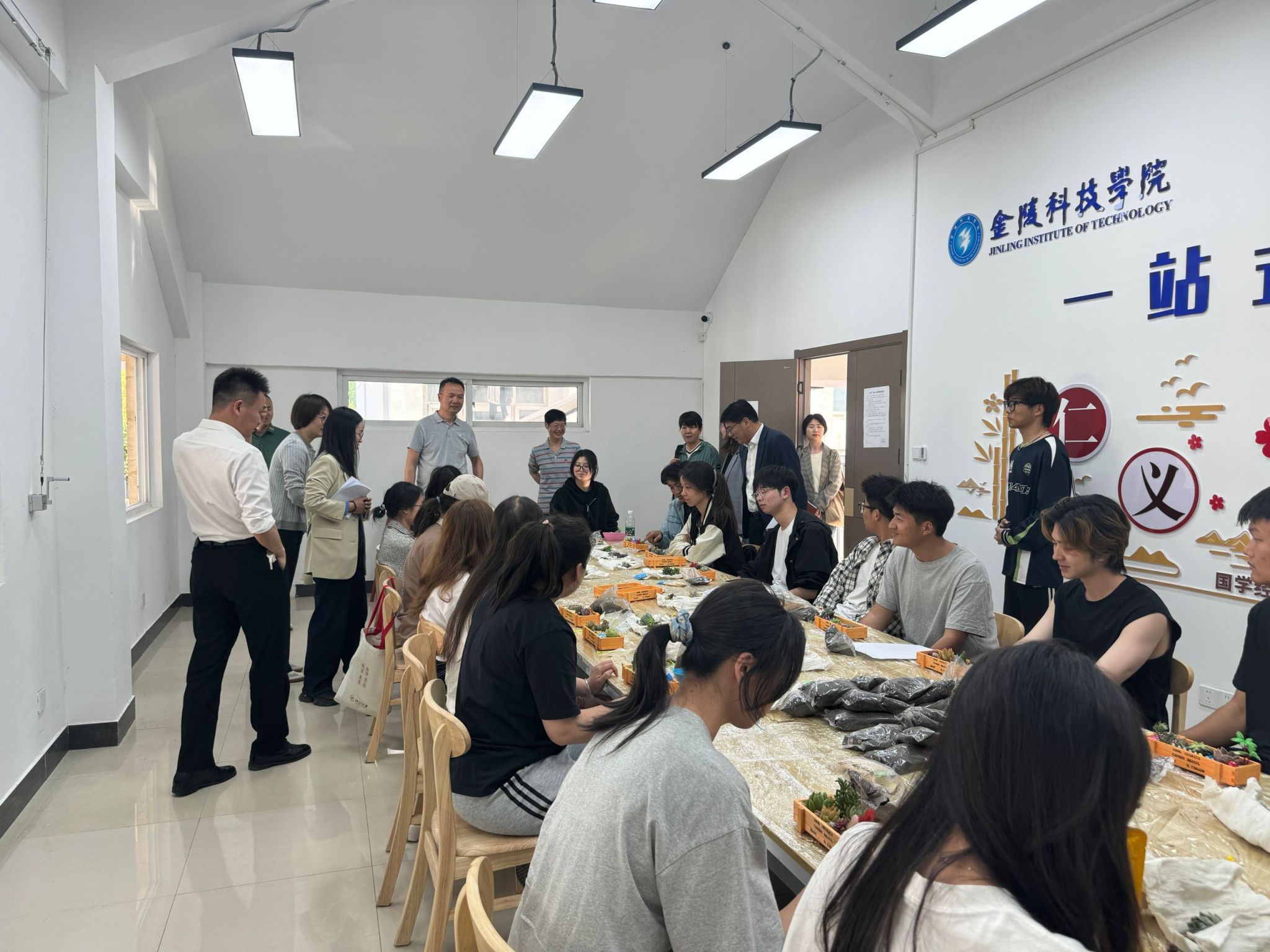 活动开场,先进行了破冰活动——“击鼓传花”自我介绍和看图识多肉小游戏。活动不仅活跃了现场的气氛,拉进同学之间的距离,也拓展了同学们对多肉植物的了解。姜老师为同学们介绍了“园艺疗法”以及绿植与心理健康的关联,并强调参与种植活动可以有效降低焦虑和压力水平,让人在与自然的互动中获得内心的平静与满足。随后,同学们自己设计,现场栽种多肉,形成具有个人特色的多肉微景观。在种植过程中,同学们一边交流种植技巧,一边分享自己民族的故事和文化。活动的最后,同学们轮流进行了设计分享,姜老师进行了点评。同学们结合自己的专业背景和成长经历,设计出丰富多彩的微景观;不同民族的同学们仿佛是一颗颗种子,相互交流与合作中生根发芽,共同成长。