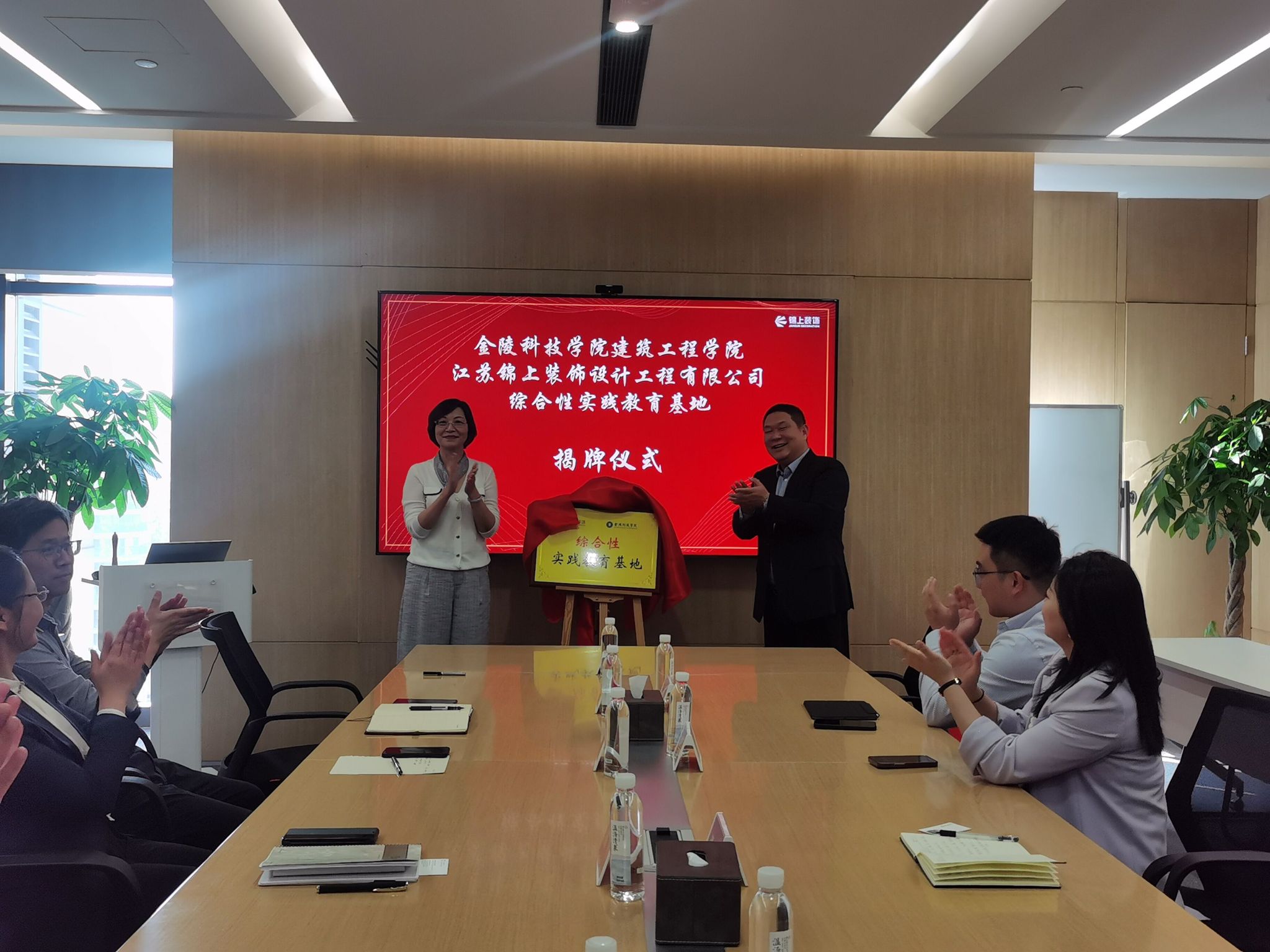 倪杰与强勇共同为云顶集团与江苏锦上装饰设计工程有限公司综合性实践教育基地揭牌。