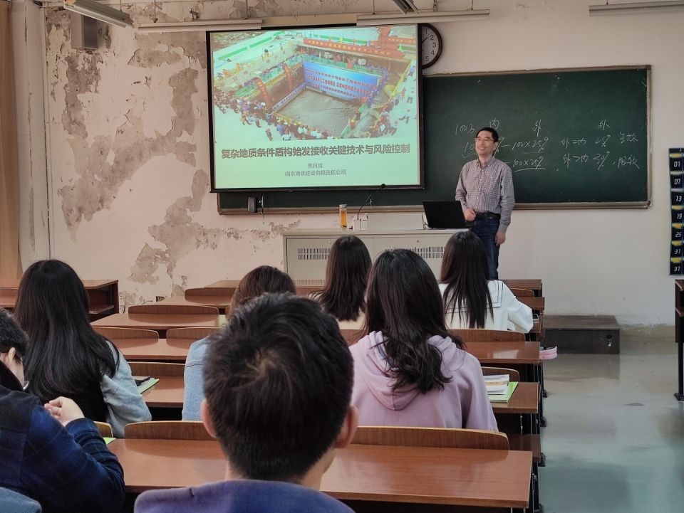 本次讲座主题为“复杂地质条件盾构始发接收关键技术与风险控制”,焦处长首先阐述了南京地铁现状及规划发展概况,然后结合南京地铁盾构施工的具体案例和自身丰富的实际工作经验,对南京地铁施工中的盾构始发接收关键技术进行了详细介绍,并分析了盾构施工中的风险控制与管理。通过本次讲座,学生们对所学专业有了更深层次的认识,提高了学习的兴趣,并对将来的职业发展方向有了新的认知和规划。