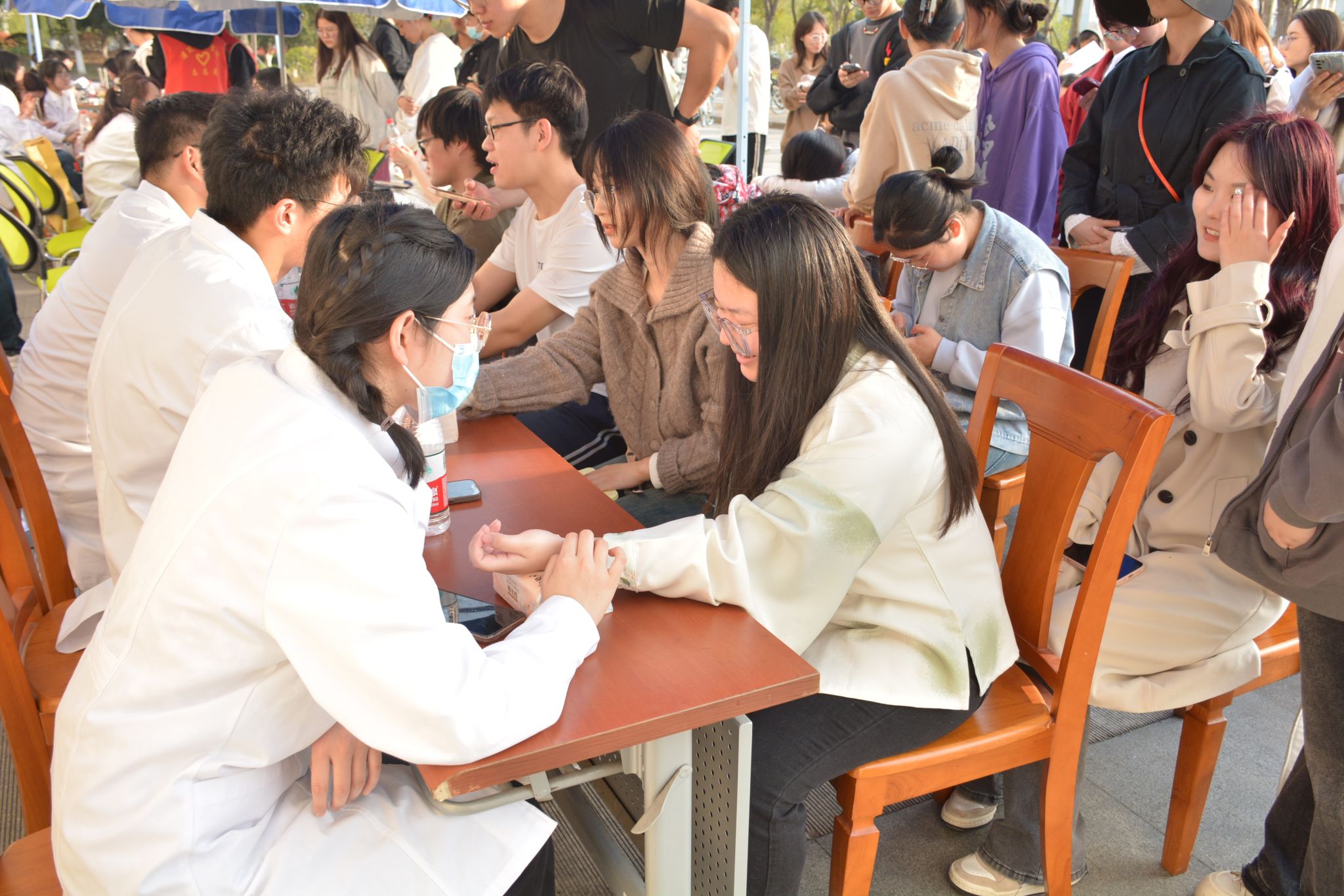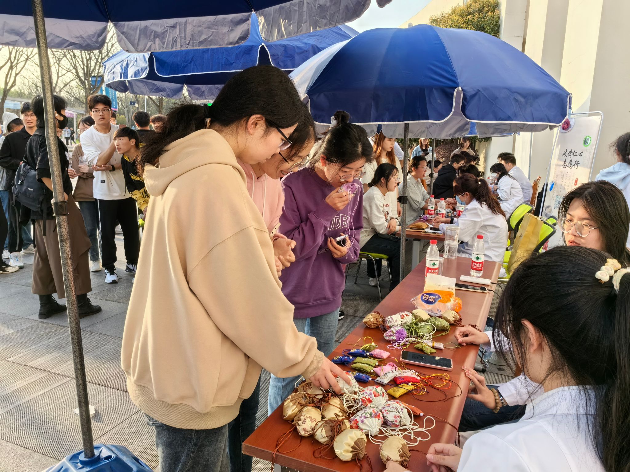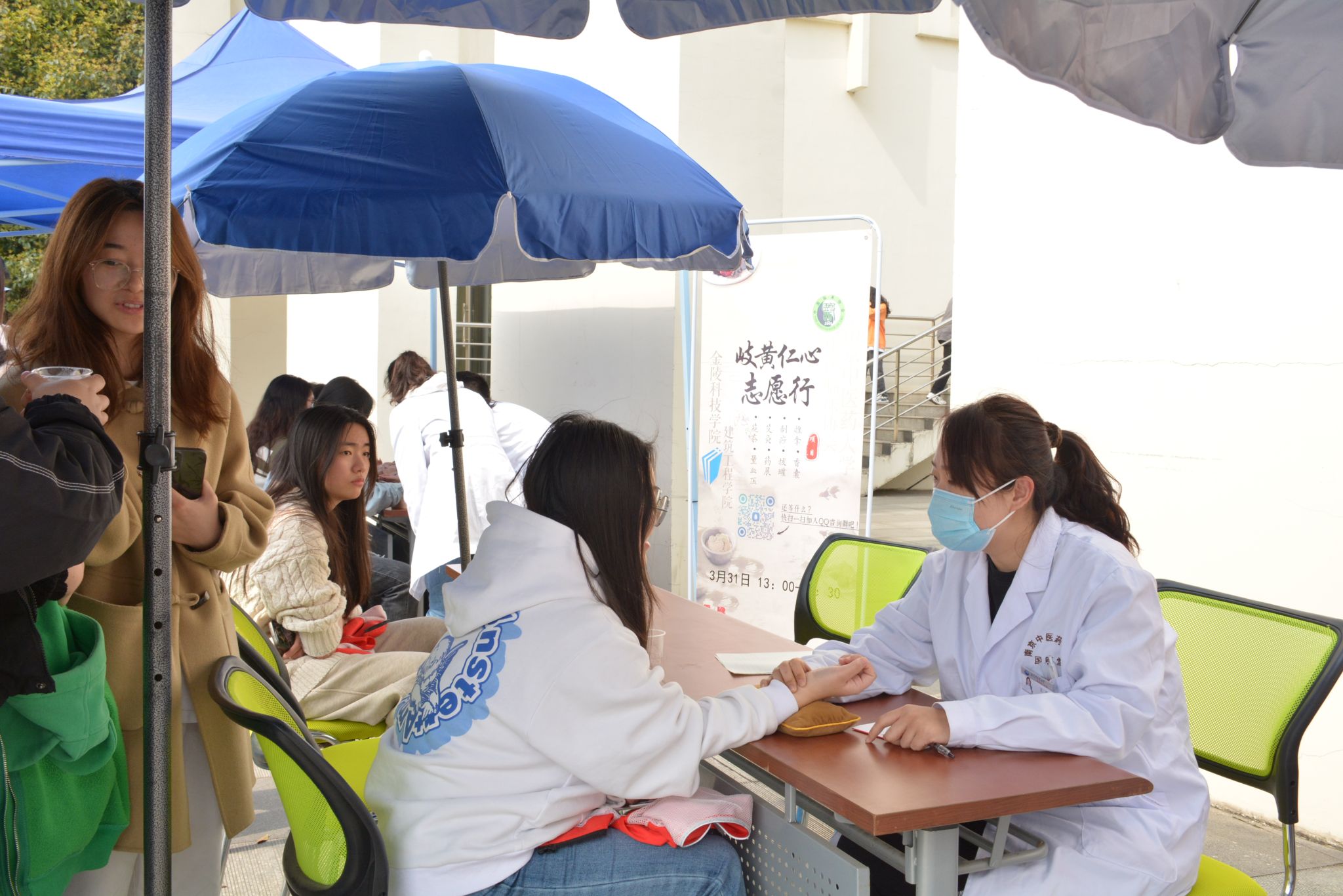青医益行,桃李共荣。2024年3月31日,云顶集团建工学院联合南京中医药大学中医临床协会,来我校江宁校区开展医疗志愿进校园活动。南京中医药大学的志愿者为金科院学生提供了量血压、香囊制作、推拿、艾灸、品尝花茶等服务,中医学科的魅力吸引了大批同学前来体验学习。