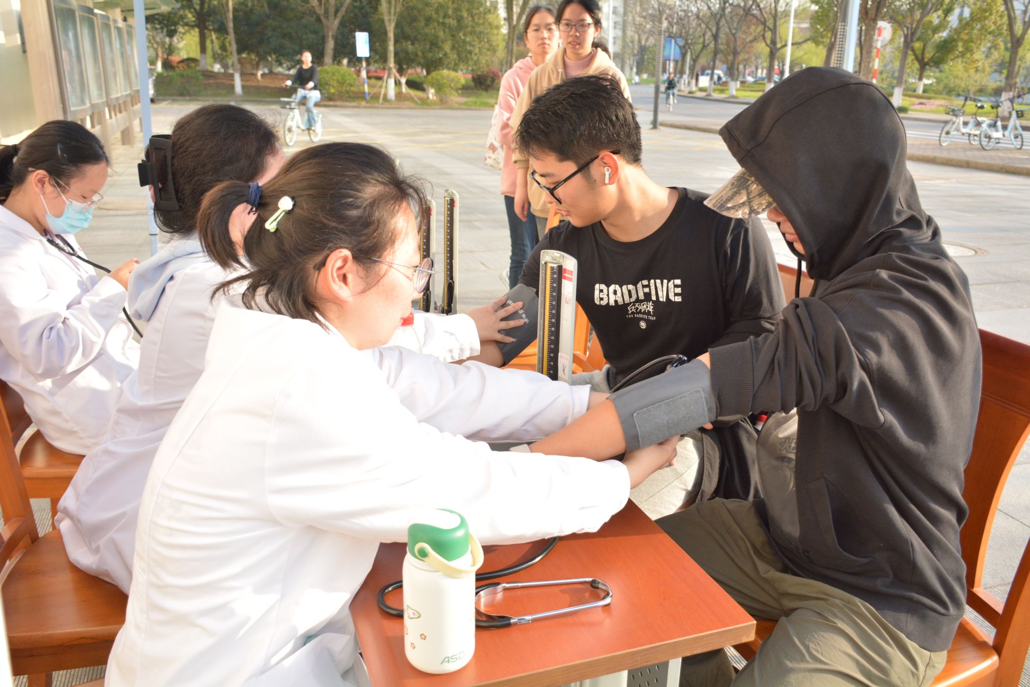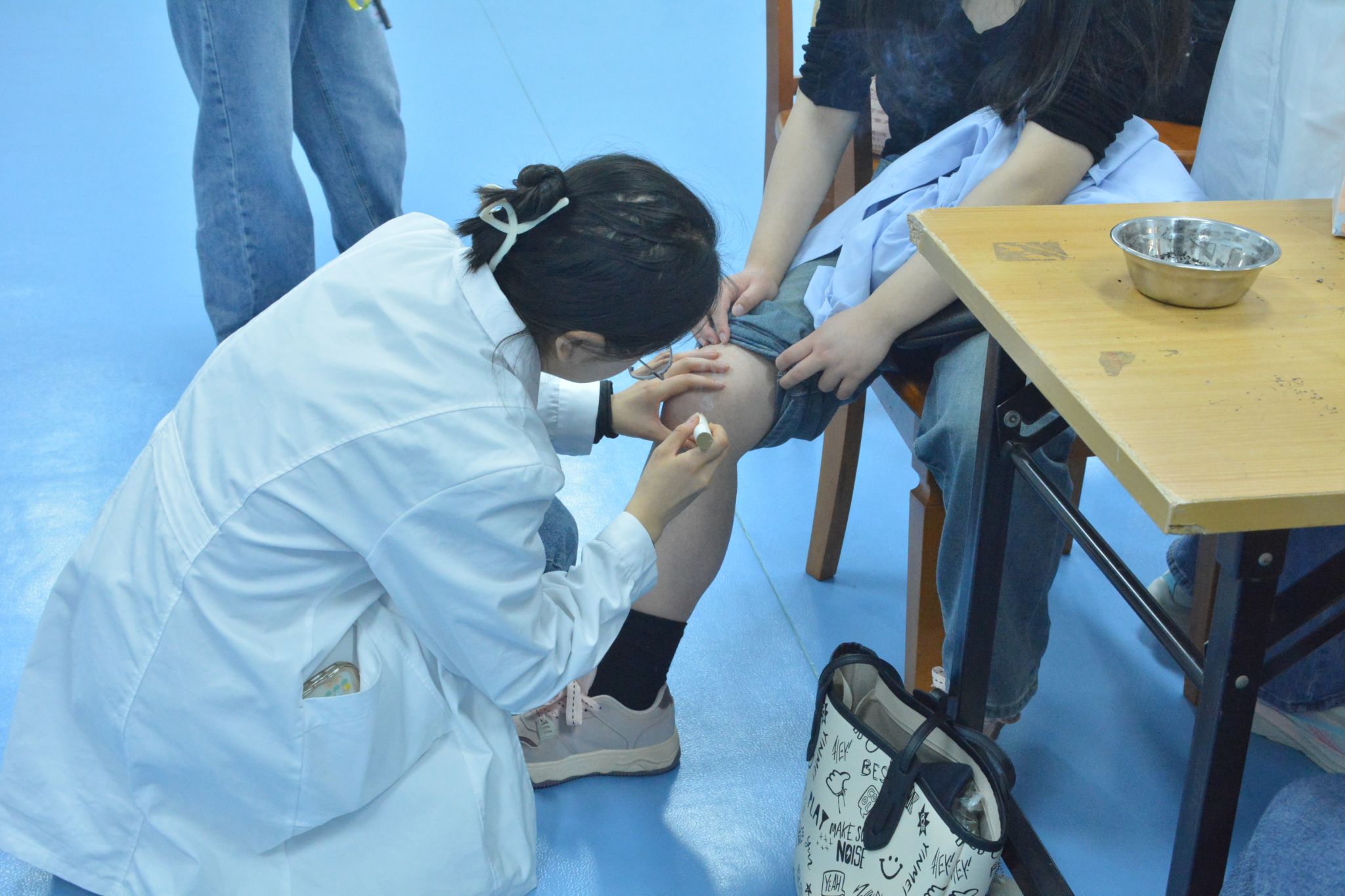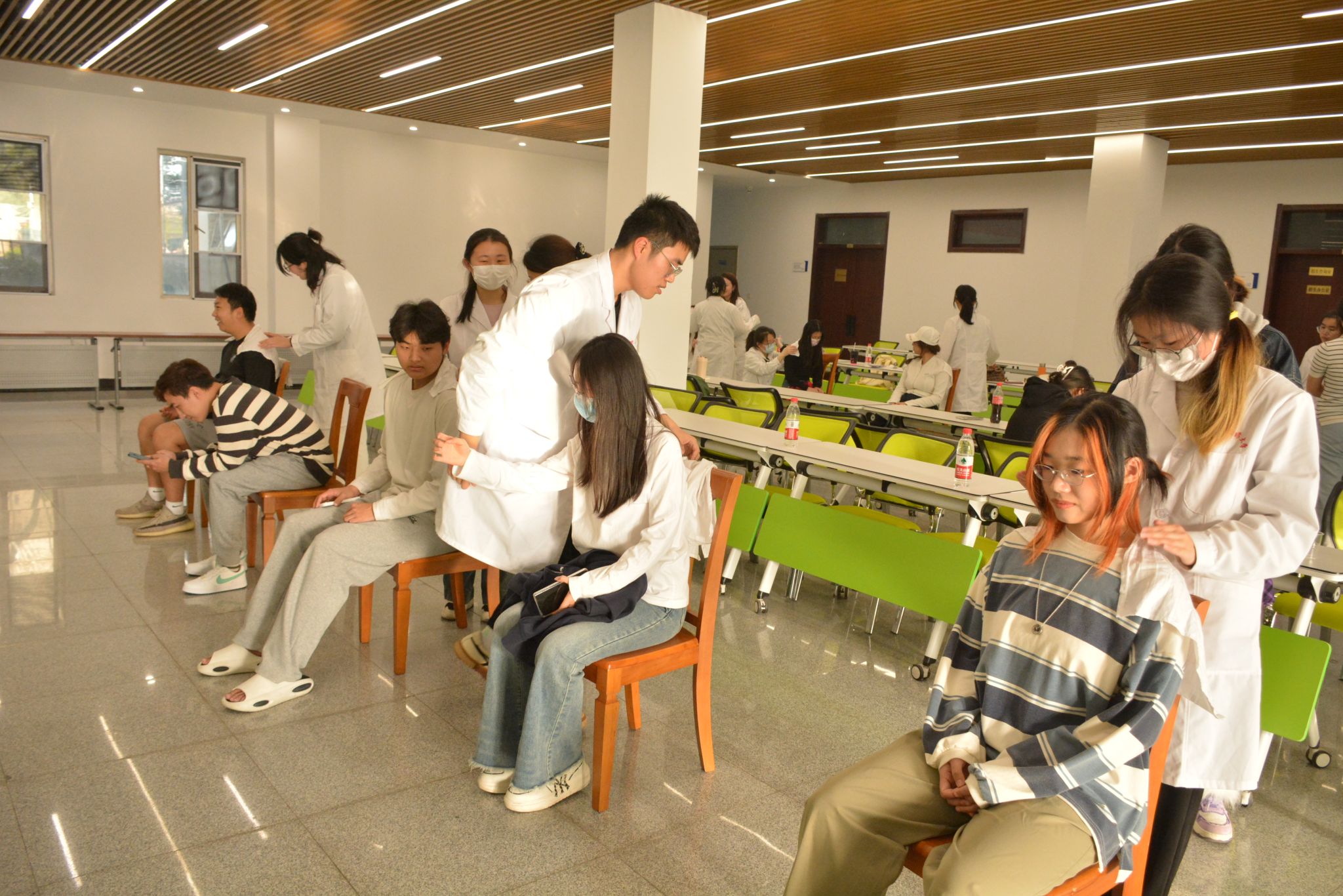 志愿者们细心地为我校就诊同学量血压、细致地讲解了药材的作用,并推荐了几种适合大部分同学的配方。由于同学们常常久坐上课、低头学习,腰部与肩颈不适的状况时有发生。义诊志愿者针对此问题,为我校同学进行了专业的中医推拿,帮助同学们疏通经络,放松肌肉,减轻身体压力。