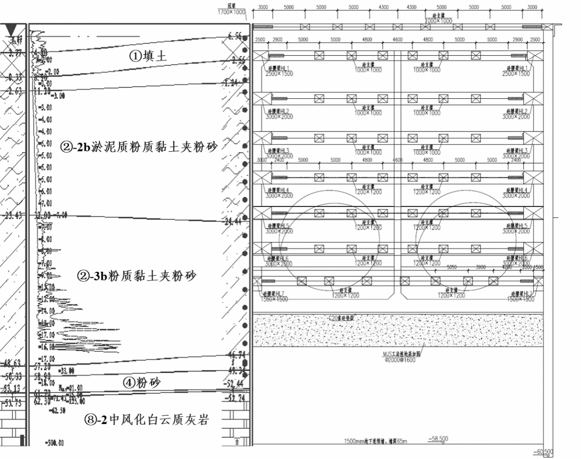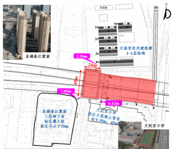 南京建宁西路过江通道位于南京长江大桥上游约2.4km处,隧道采用外径14.5m的大直径盾构方案穿越长江,南岸接南京鼓楼老城区,北岸接江北新区的核心区,沿线分布多处国家级文物、铁路、学校及长江航道等敏感点,周边环境极为复杂。建宁西路过江通道(一期)工程南岸盾构接收井位于鼓楼滨江商务区,结构外尺寸为45m×24m(长×宽),深度达44.8米,为超大、超深基坑。基坑周边紧邻天保里文物保护建筑群等敏感建筑,最小距离不足3m;且基坑开挖地层主要为淤泥质粉质粘土、粉质粘土等软土层,属于典型的富水软土城市敏感地区超深基坑,工程施工及周边环境变形控制难度极大。