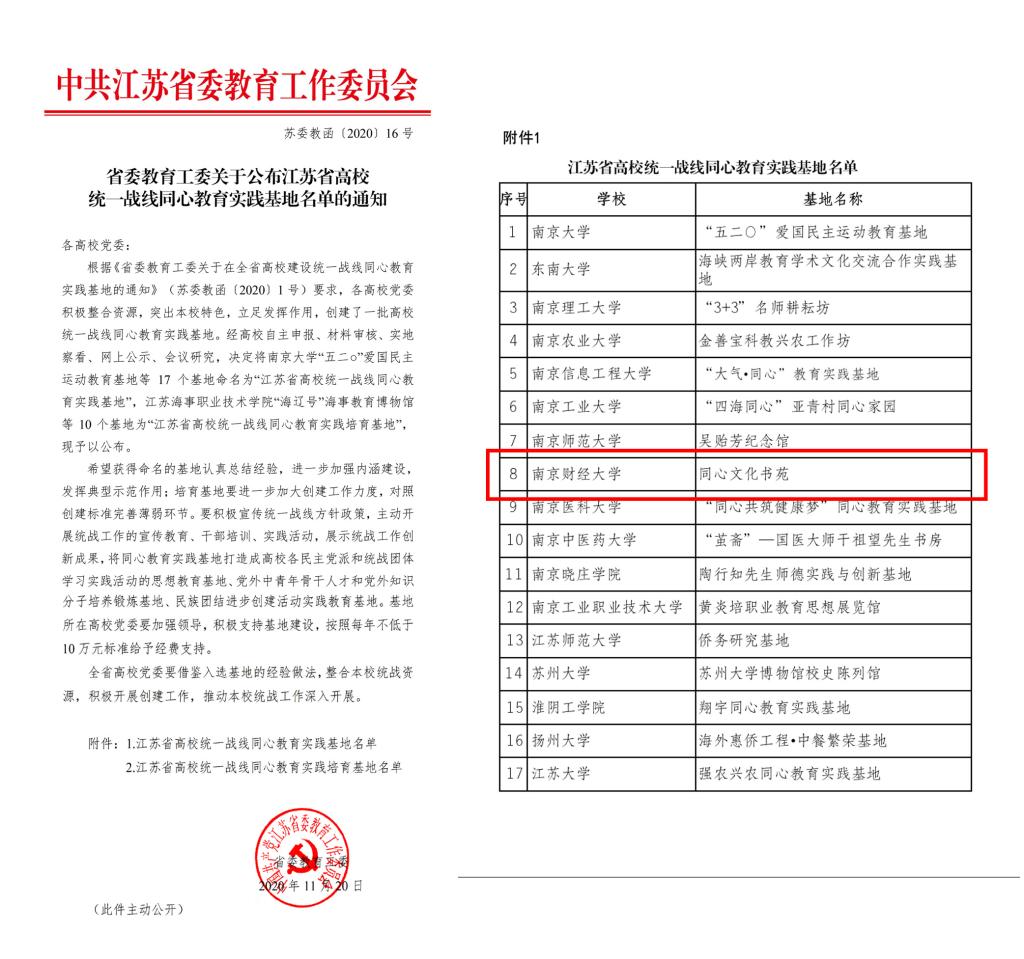 日前,江苏省委教育工委发布《关于公布江苏省高校统一战线同心教育实践基地名单的通知》,经自主申报、材料审核、专家评审、实地察看、网上公示等环节,我校“同心文化书苑”入选首批“江苏省高校统一战线同心教育实践基地”。