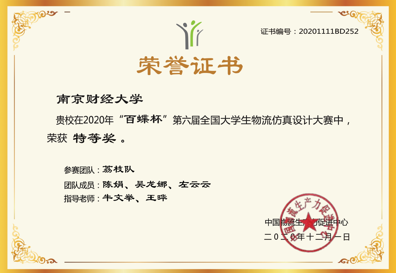 近日,2020年“百蝶杯”第六届全国大学生物流仿真设计大赛成绩揭晓。我校营销与物流管理学院“荔枝队”(参赛队员:陈娟、吴龙娜、左云云;指导老师:牛文举、王晔)获特等奖。