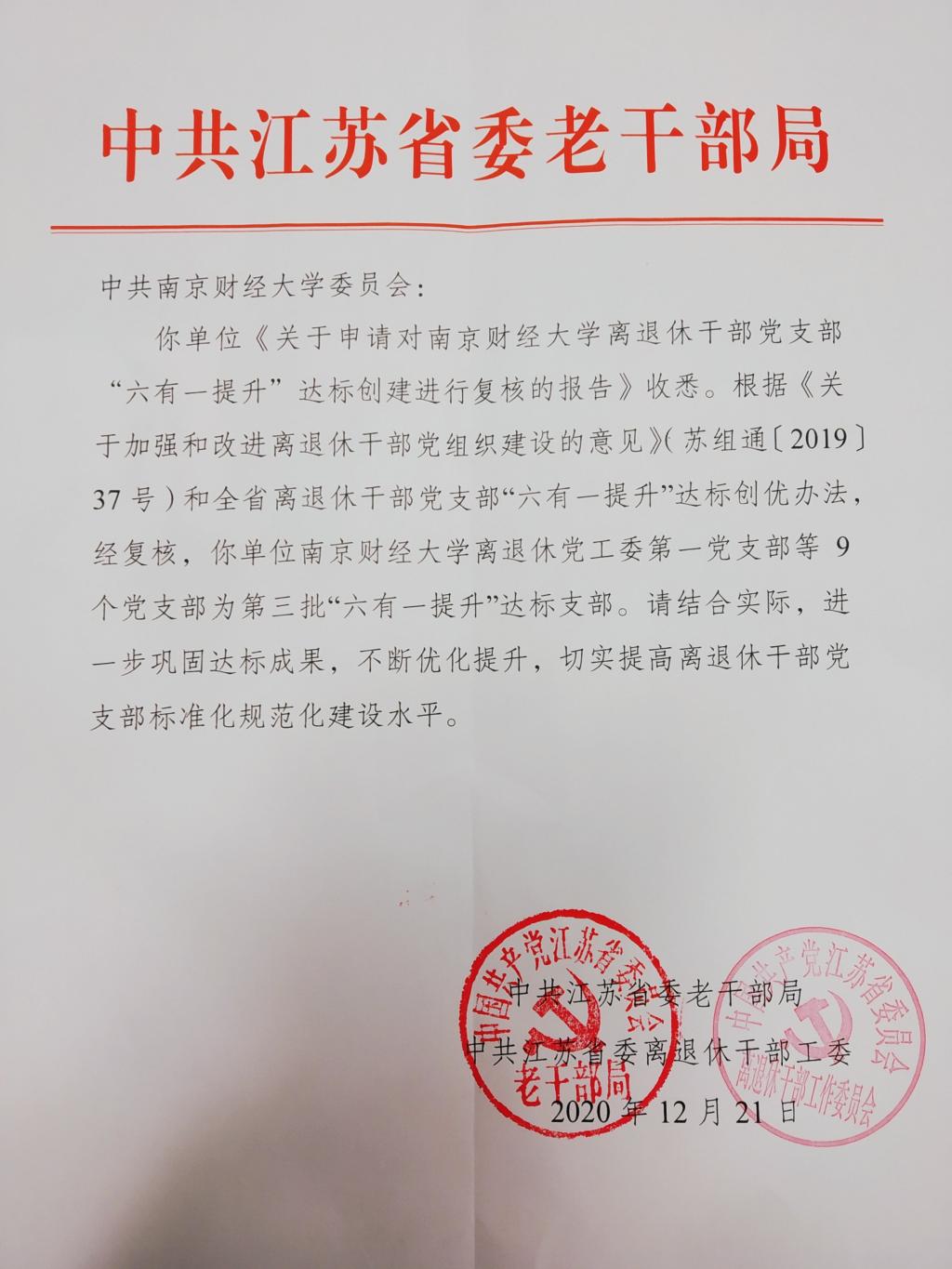 继离退休党工委关工委支部获批全省离退休干部“六有一提升”示范党支部后,我校离退休干部党建工作再传喜讯。12月24日,接中共江苏省委老干部局通知,我校报送的9个离退休干部党支部(含在职教工党支部)一次性全部通过验收,获批全省离退休干部党支部第三批“六有一提升”达标支部。
