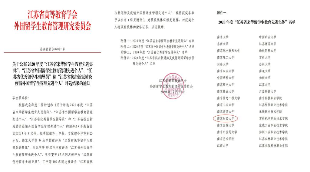 近日,江苏省高等教育学会外国留学生教育管理研究委员会公布2020年度“江苏省来华留学生教育先进集体”评选结果(苏高留管〔2020〕7号),我校获评“江苏省来华留学生教育先进集体”。