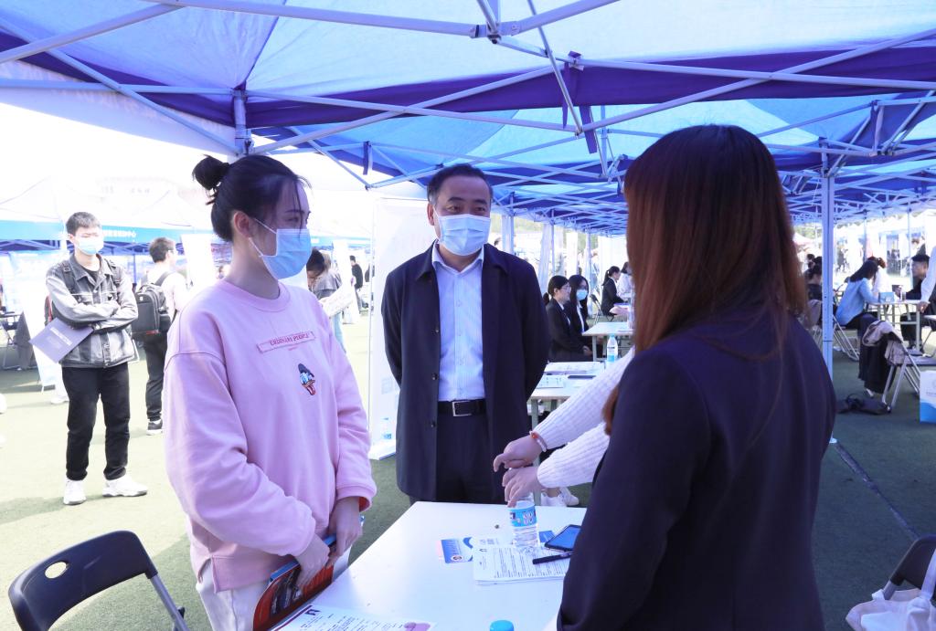程永波校长详细了解了我校毕业生就业总体情况、就业需求情况、此次招聘会整体情况和近年来的毕业生职业发展情况,强调要进一步加强和用人单位的精准对接,将社会对人才培养的要求融入学校教育教学全过程,动态提升学校人才培养能力,全面提高学校人才培养质量。程永波校长与前来求职的同学们深入交流,希望同学们充分运用学校创设的教育资源,不断提升自己的学识本领和就业竞争力,力争成为岗位上的“第一”甚至“唯一”。希望同学们牢记习近平总书记的殷切嘱托,志存高远、脚踏实地,立足岗位实际,勇担时代使命。
