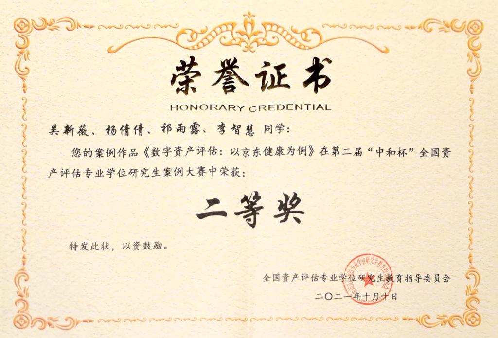 近日,第二届“中和杯”全国资产评估专业学位研究生案例大赛落下帷幕。经过学校初选、全国线上初赛和全国现场复赛近3个月的激烈角逐,我校参赛作品《数字资产评估:以京东健康为例》(团队成员:2020级资产评估专业硕士研究生吴新薇、杨倩倩、祁雨露、李智慧,指导教师:刘小峰)获全国二等奖。