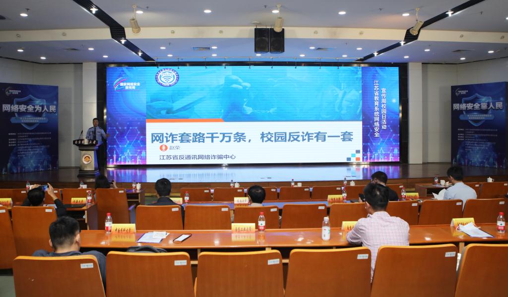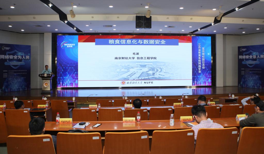活动期间,在场领导和嘉宾观看了校园情景剧《扫码行骗记》。江苏省反通讯网络诈骗中心民警赵荣作了“网诈套路千万条,校园反诈有一套”的讲座,我校信息工程学院教授毛波作了“粮食信息化与数据安全”的专题报告。活动中还公布了网络安全有奖知识竞答中奖人员名单。