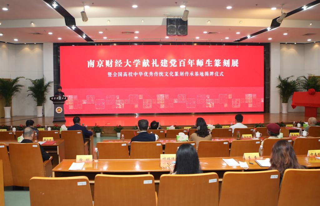 10月15日,“金石永年 艺心向党”献礼建党百年师生篆刻展暨全国高校中华优秀传统文化篆刻传承基地揭牌仪式在我校仙林校区举行。省社科联党组书记、常务副主席张新科,省教育厅二级巡视员李金泉,仙林大学城管委会主任袁传军,省书法家协会原主席尉天池,我校党委书记张利民,校领导温潘亚、时现、李茜、乔均、黄建元、李群、朱琴华出席活动,省教育厅相关领导、多位地方印社社长及篆刻名家、兄弟高校师生代表共襄盛举,我校相关职能部门、学院领导及师生代表参加活动。揭牌仪式由党委常委、副校长时现主持。