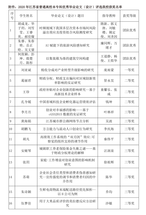 附件:2020年江苏省普通高校本专科优秀毕业论文(设计)评选我校获奖名单