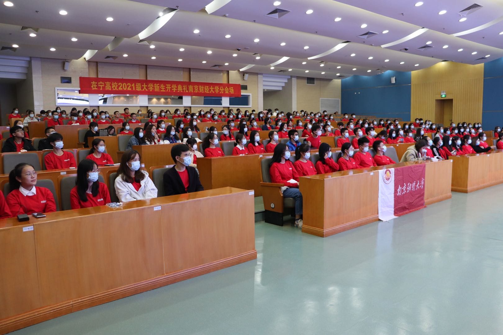 在仙林校区图书馆报告厅分会场,我校新生代表们集中观看了开学典礼。在与主会场互动环节,当镜头切换到南京财经大学分会场时,同学们精神昂扬向主会场挥手示意,向活动嘉宾和南京其他高校展示了南财学子们积极向上的精神面貌。