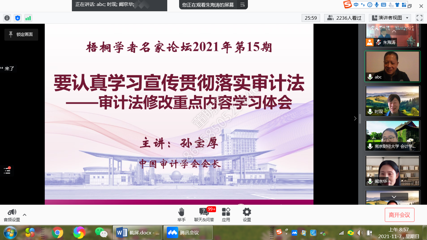 《全国人民代表大会常务委员会关于修改<中华人民共和国审计法>的决定》已由第十三届全国人民代表大会常务委员会第三十一次会议于2021年10月23日通过,自2022年1月1日起施行。为了全面掌握本次《审计法》的修改内容,11月7日上午,审计署原副审计长、中国审计学会会长孙宝厚应邀走进我校会计学院梧桐学者名家论坛,通过腾讯会议,以“要认真学习宣传贯彻落实审计法——审计法修改重点内容学习体会”为题,就《审计法》的修改背景和修改重点内容进行深入讲解。论坛由党委常委、副校长时现主持,会计学院、红山学院部分教师和近1500名学生参加了本次论坛。