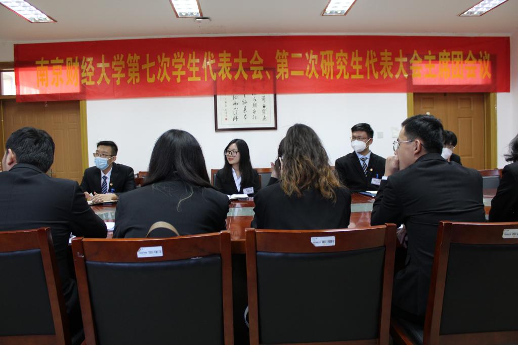 随后,学代会、研代会各个代表团进行分组讨论,审议工作报告,讨论大会选举办法、第七届学生会委员会、第二届研究生会委员会委员候选人名单、大会选举工作人员建议名单,讨论《南京财经大学学生会章程(草案)》《南京财经大学研究生会章程(草案)》。