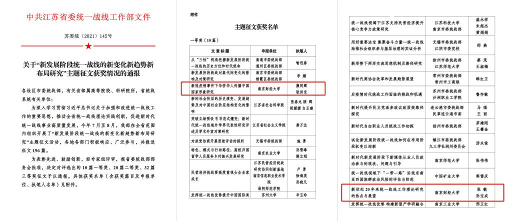 为深入学习贯彻习近平总书记关于加强和改进统一战线工作的重要思想,推动全省统一战线理论实践创新,促进新时代统一战线事业高质量发展,今年7月,省委统战部在全省范围内组织开展“新发展阶段统一战线的新变化新趋势新布局研究”主题征文活动。经个人申报、校内初评、择优推荐,我校推荐的论文从全省196篇征文中脱颖而出,其中工商管理学院廉同辉副教授的论文《新冠肺炎疫情事件下华侨华人传播中国国家形象研究》获得一等奖,营销与物流管理学院张敏教授的论文《新世纪20年来统一战线工作理论研究的热点与展望》获得二等奖。