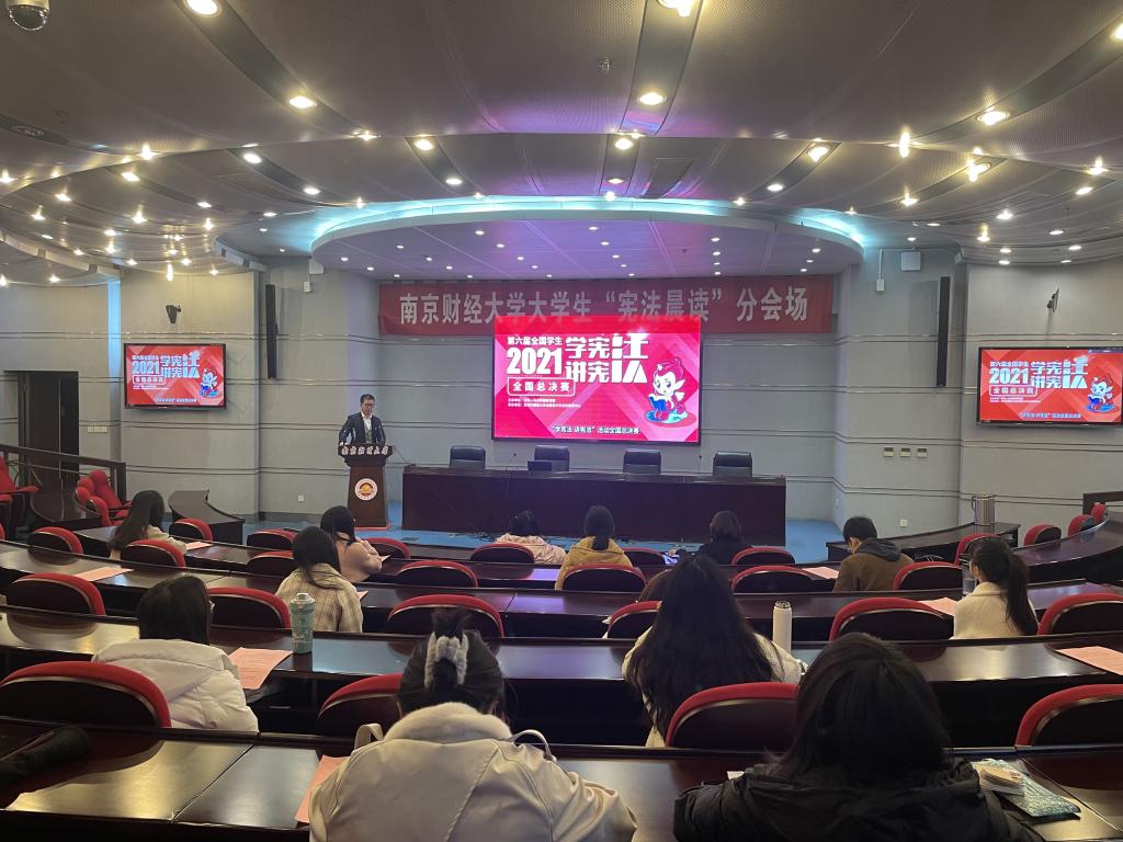 12月3日上午,我校在仙林校区行政楼二楼报告厅设立大学生“宪法晨读”分会场,组织部分师生网络连线教育部全国青少年普法网,同步参与教育部在北京主会场开展的2021年国家宪法日教育系统宪法晨读活动。同时,各学院也广泛组织同学观看和参与直播活动,开展宪法学习教育。活动中,学生们通过网络直播观看升旗仪式、唱国歌、进行宪法晨读、聆听歌曲《宪法伴随我们成长》,并观看第六届全国学生“学宪法 讲宪法”活动全国总决赛优秀学生的展演。“宪法晨读”活动,激发了同学们不断学习法律知识、提高自身法律素质的强烈意愿,增强了师生的法治观念并弘扬了宪法精神。