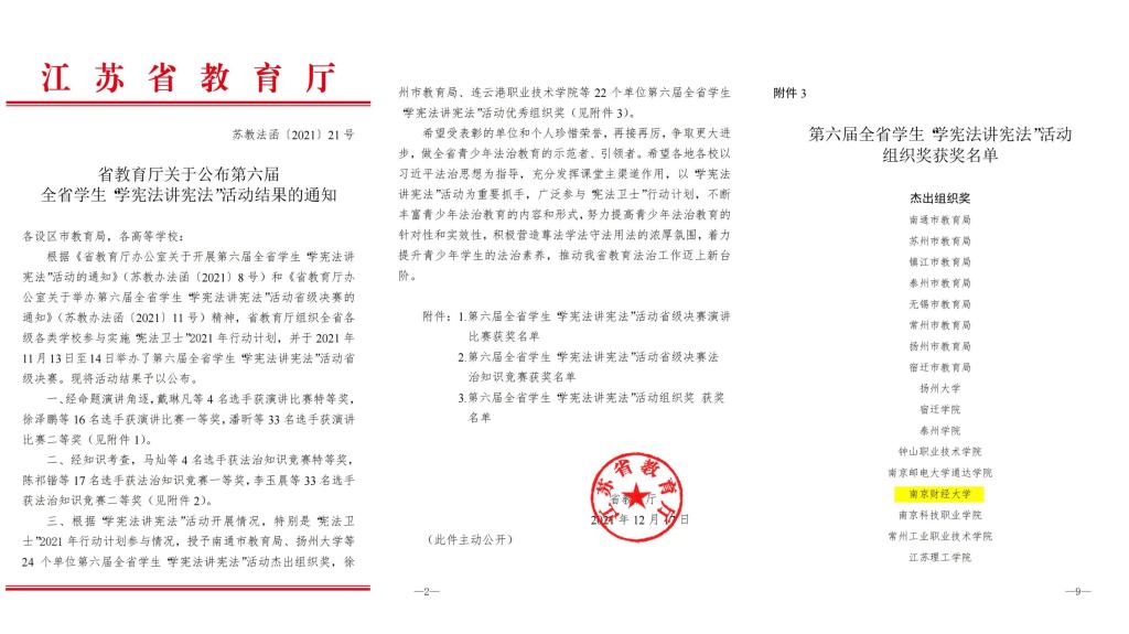 近日,省教育厅公布了第六届全省学生“学宪法讲宪法”活动评选结果,我校获“杰出组织奖”,法学院朱叶琪同学获法治知识竞赛一等奖,法学院王芷妍同学获演讲比赛二等奖。