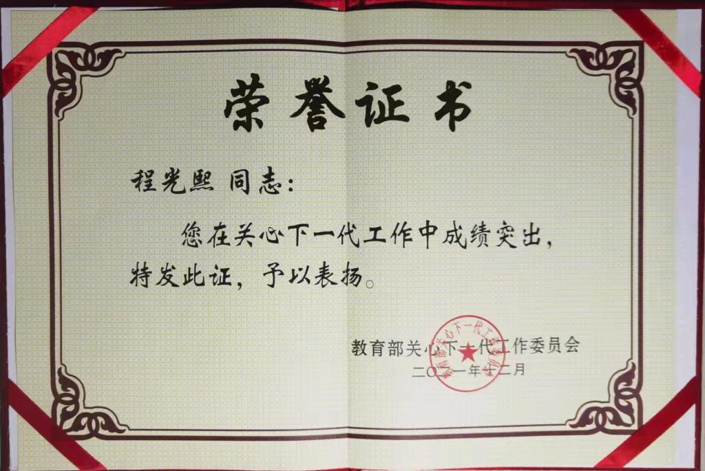 程光熙同志获教育部关心下一代工作委员会“突出贡献奖”表彰