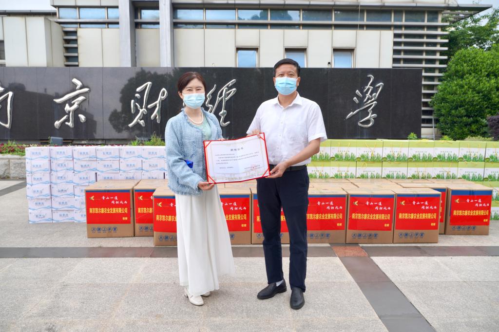 4月27日,江苏凯尔康国际贸易有限公司向我校捐赠防疫物资,包括5万只医用口罩、720瓶硅素水、300盒德逸嫩苗青汁粉。校党委书记张利民,校党委副书记(正校级)温潘亚,南京市政协委员、南京市政协文教卫体委员会副主任(兼)、江苏凯尔康国际贸易有限公司、南京凯尔康农业发展有限公司董事长兼总经理钱明洁,副总经理徐承龙、朱海菊,市场总监张莉佳,我校党校办、党委宣传部、校工会、保卫处、机关党委、后勤基建处等有关部门负责同志参加捐赠活动。