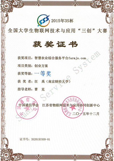 近日,由中国通信学会和江苏省物联网技术与应用协同创新中心联合主办的2015年3S杯全国大学生物联网技术与应用“三创”大赛决赛在南京邮电大学举行。来自清华大学、东南大学、苏州大学等31所高校的113个参赛项目参加了决赛。我校研究生的科研项目“智慧农业综合服务平台” (成员:汪禹、曹伟、吴增明,指导教师:曹克)获得全国一等奖。