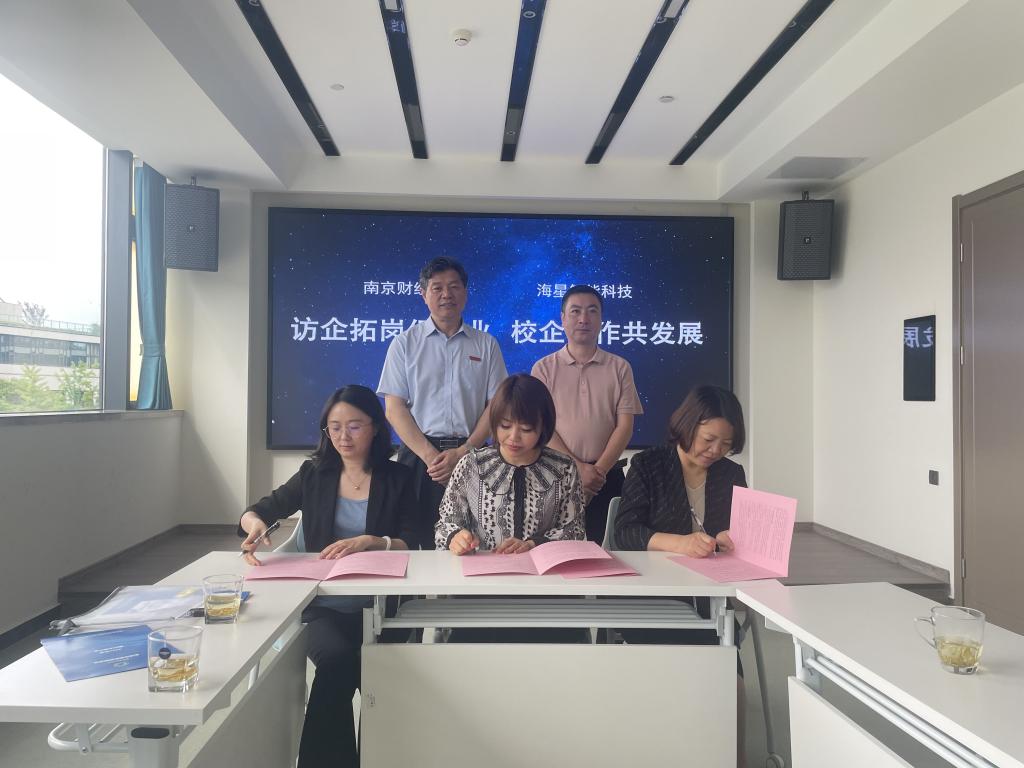 李玉琴书记、陈苏书记分别与公司代表签订实习就业基地协议,温潘亚副书记为南京海星智能科技发展有限公司和江苏省安立丰控股集团“南京财经大学就业实习实践基地”授牌。