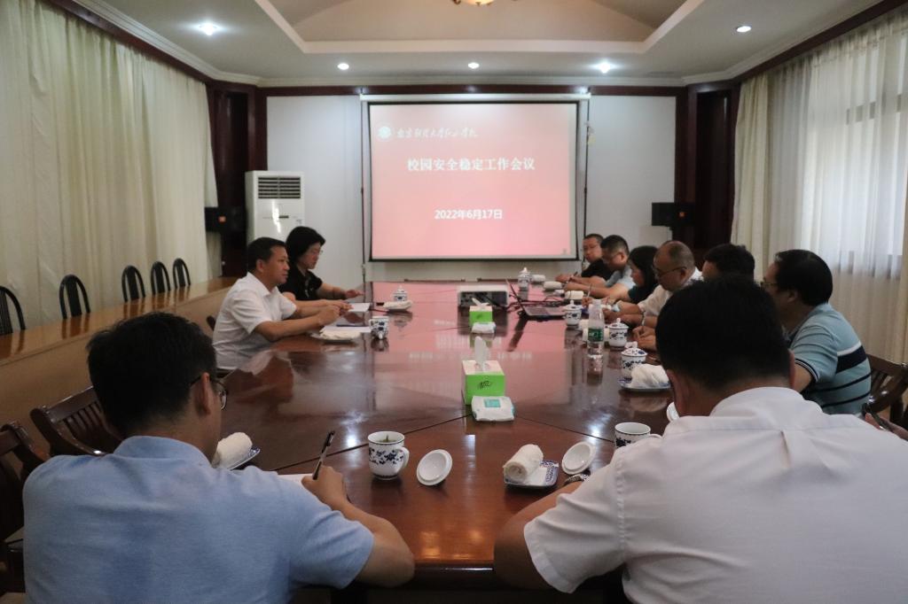 校领导强调,要进一步提高政治站位,坚持底线思维,时刻绷紧安全稳定这根弦,认真开展安全风险隐患排查整治工作,不断完善安全工作长效机制。要更加高效地统筹疫情防控和事业发展,进一步加强和改进师生思想政治工作,全力维护政治安全和意识形态安全,切实维护校园安全稳定。要进一步加强依法治校,实行精细化管理,着力推进治理体系和治理能力现代化。要深入开展教职工党员联系学生宿舍结对行动,打通全员育人“最后一公里”,助力学生健康成长全面发展。要加强与安徽新华集团的沟通和联系,积极稳妥推进红山学院迁址和转设办学各项工作。要提前谋划并认真做好假期及下学期开学前各项准备工作,以实际行动和优异成绩迎接党的二十大胜利召开。