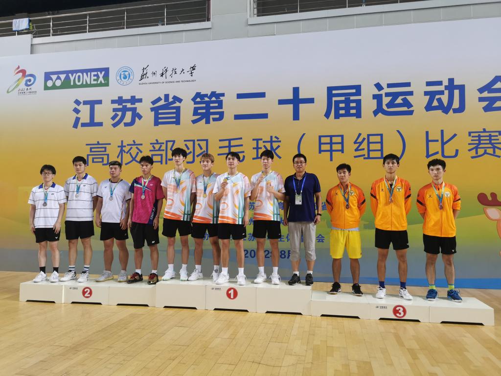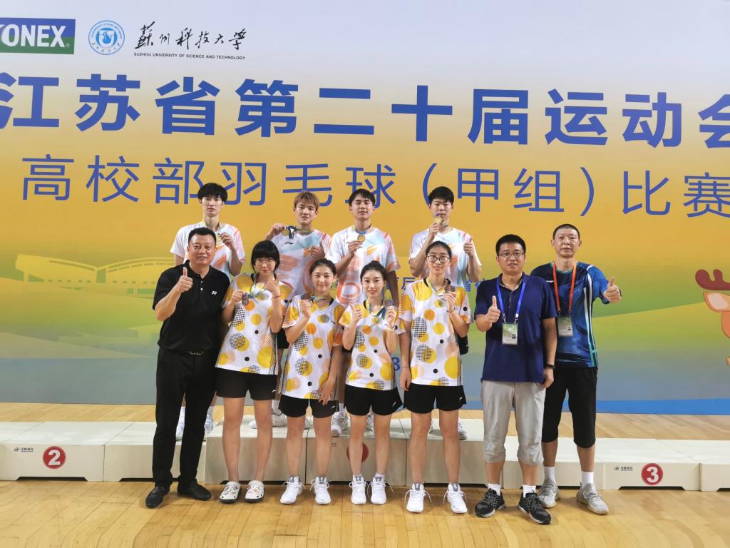 江苏省第二十届运动会高校部比赛分为本科院校高水平组(甲A)和本科院校普通组(甲B),共有男团、女团、男单、女单、男双、女双、混双七个竞赛项目,我校羽毛球项目代表队参加甲A组比赛,在体育部主任何强为领队、潘杰年老师为主教练的带领下,队员傅泓翔、张容瑞、杜仲夏、魏楷培夺得男团冠军,傅泓翔和张容瑞夺得男双冠军,傅泓翔、贾子硕夺得混双冠军,贾子硕、张宇洁夺得女双亚军,贾子硕、谭玏瑄、廖梓含、张宇洁夺得女团季军。