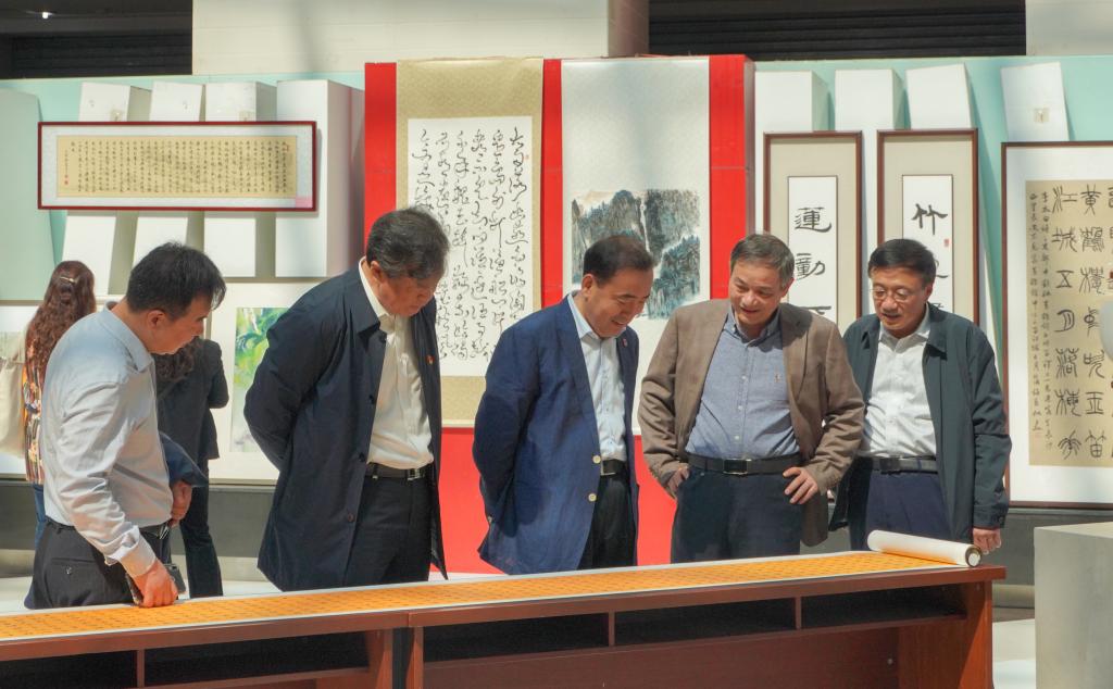 开幕式结束后,与会领导、教职工代表、学生代表共同欣赏参展作品,并与现场的书画爱好者进行交流与探讨。