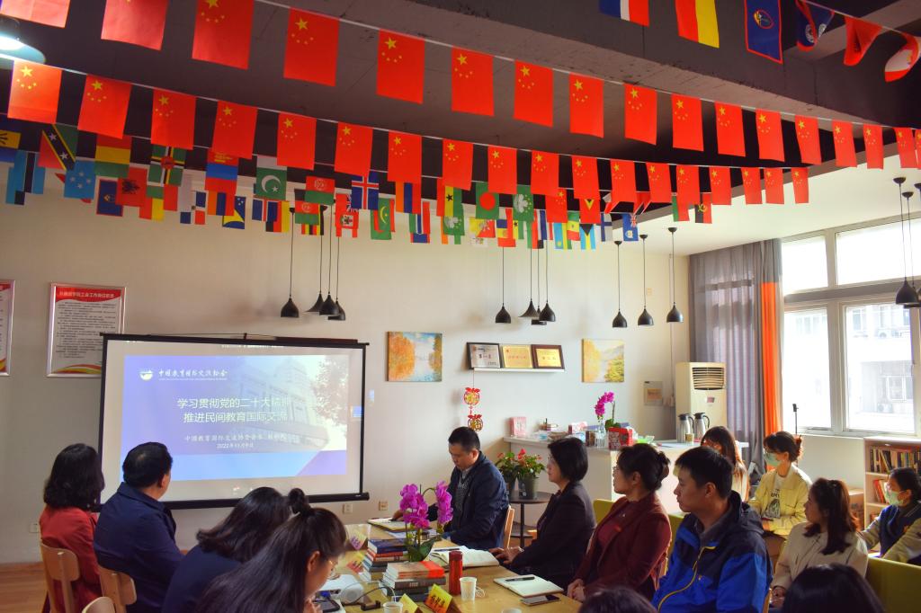 会上,全体参会人员首先集中收看了中国教育国际交流协会会长、前教育部副部长刘利民主讲的“学习贯彻党的二十大精神,推进民间教育国际交流”专题辅导报告现场直播。报告中,刘利民会长解读了党的二十大提出的新思想、新论断和作出的新部署、新要求,强调了党的二十大报告对教育外事工作的重要指导意义,提出了要以党的二十大精神引领我国教育国际交流迈上新台阶,努力推进业务覆盖全球、资源优势共享、治理体系完善、有中国特色和国际影响力的教育国际交流合作,共同谱写国际合作新篇章,以高水平教育对外开放推进中国教育现代化,为中国式现代化建设提供有力支撑,为构建人类命运共同体作出新的更大贡献。随后,参会党员代表结合工作实际,就学习领会党的二十大精神分享了心得体会。