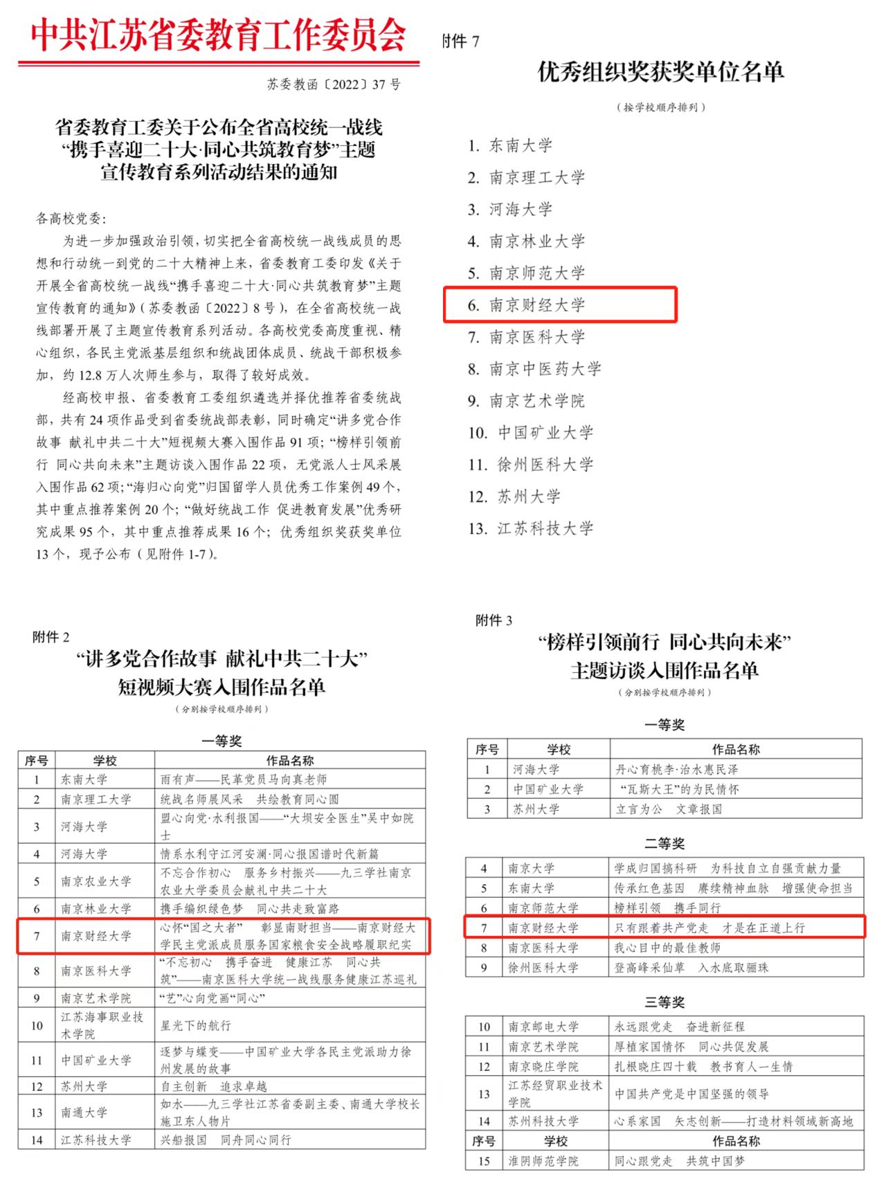 为充分展示江苏高校参与多党合作事业的丰硕成果,进一步加强政治引领,切实将全省高校统一战线成员的思想和行动统一到党的二十大精神上来,今年上半年,省委教育工委在全省高校部署开展了统一战线“携手喜迎二十大·同心共筑教育梦”主题宣传教育系列活动。我校党委高度重视、精心组织,各党派(团体)基层组织和广大统战成员、统战干部积极参与,充分展现了我校各民主党派、党外知识分子与中国共产党风雨同舟、肝胆相照的精神风貌。经学校申报、省委教育工委评审,我校在全省高校五个类别的作品评比中均获表彰,其中“心怀‘国之大者’彰显南财担当——南京财经大学民主党派成员服务国家粮食安全战略履职纪实”荣获“讲多党合作故事 献礼中共二十大”短视频大赛一等奖(同时荣获省委统战部三等奖);“只有跟着共产党走 才是在正道上行”获“榜样引领前行 同心共向未来”主题访谈二等奖(同时荣获省委统战部三等奖);“大地上漂泊的文化传播使者”获无党派人士风采展二等奖;“为党育人 为国育才”被评为“海归心向党”归国留学人员重点推荐优秀工作案例;“数字时代党外青年人才政治引领与政治参与问题研究——基于江苏省高校的调查”被评为“做好统战工作 促进教育发展”重点推荐优秀研究成果。
