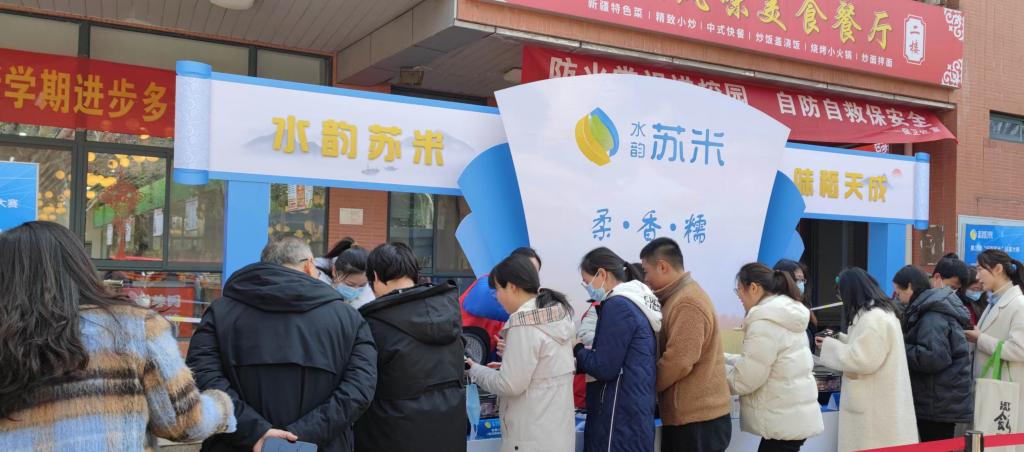 除此之外,东苑食堂室外现场搭建了播放“水韵苏米”宣传片的展台LED屏,还布置了“爱粮节粮·有你有我”的光盘行动海报。工作人员向大家介绍“水韵苏米”品牌历史,发放“水韵苏米”品牌推广、爱粮节粮、膳食健康指南等宣传资料,在推广品牌的同时,宣传“厉行节约、反对浪费”的健康消费理念,呼吁大家积极参加光盘行动。现场志愿者为“光盘”的师生准备了精美纪念品,邀请他们在节粮减损主题横幅上签名并拍照互动。江苏省粮油质量监测中心工作人员在活动现场提供粮油科普宣传服务,介绍如何选米、淘米和煮饭的小知识,并提供大米检验服务。南粮集团也在现场开展了面向我校师生的“苏米进校园·展销优惠购”活动。