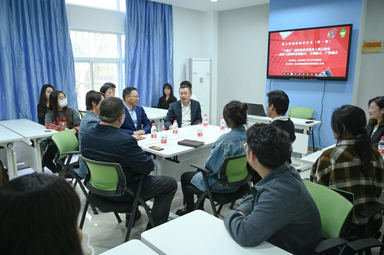 赵国栋副校长为“能力树创新创业沙龙”揭牌,随后参加了第一期“能力树”创新创业沙龙。本次沙龙主题为“‘三融合’创新创业实践育人模式探索——南财大创园的思创融合、专创融合、产教融合”。沙龙现场,卜金涛书记介绍了“能力树”创新创业沙龙的基本情况。韩力争部长表示,大学生创新创业园是我校学生参与创新创业实践的重要窗口与服务平台,今后将进一步加强园区创业孵化、培训、展示等功能,通过不断推进“能力树”创新创业沙龙等一系列创新创业工作项目,助力大学生成长为推动区域经济社会发展的生力军。企业嘉宾毛友俊分享了创业感悟,提出创业要不忘初心、持之以恒、专注前行。青年创业者张子信、瑟琳格同学结合自身创业经历,畅谈创业过程中的收获。现场同学们踊跃发言,提出了创业过程中的困惑和想法,并对资源整合、硬件设施等方面提出了需求和建议。