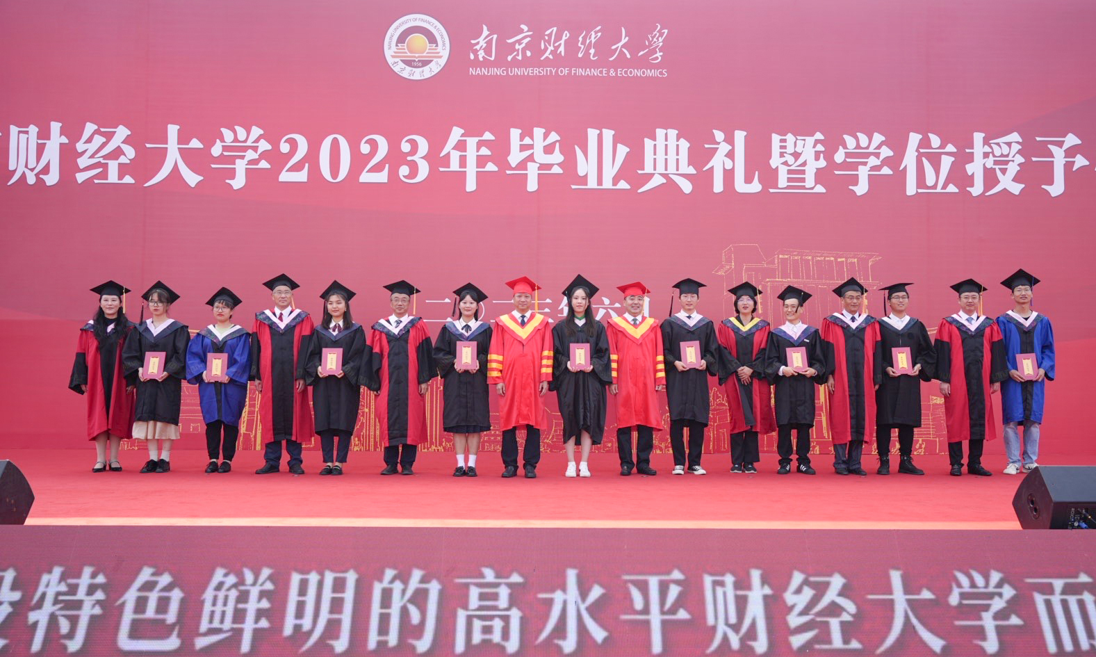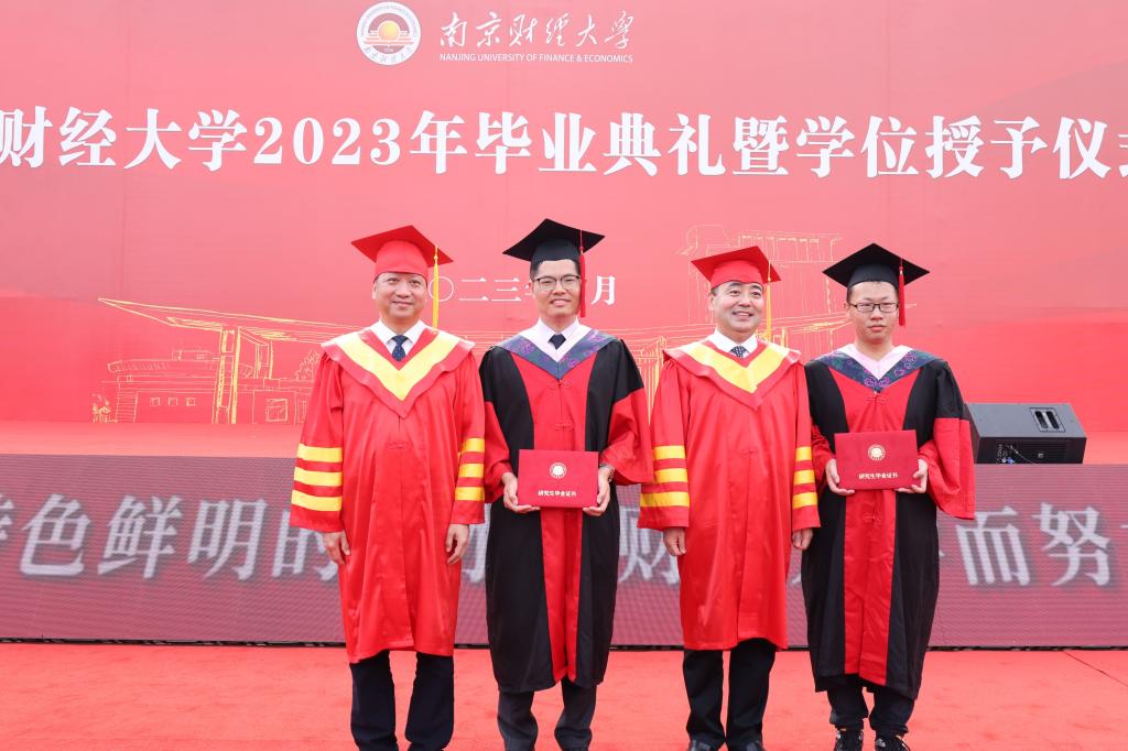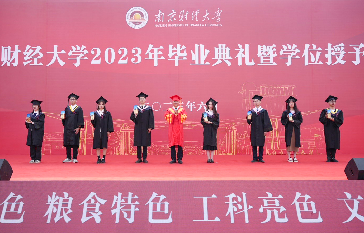 校领导为2023届毕业生代表颁发毕业证书,为2023届优秀毕业生代表、获“2023年度江苏省普通高校省级优秀毕业生”称号的毕业生颁发荣誉证书。
