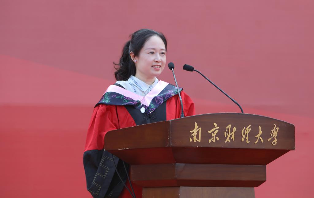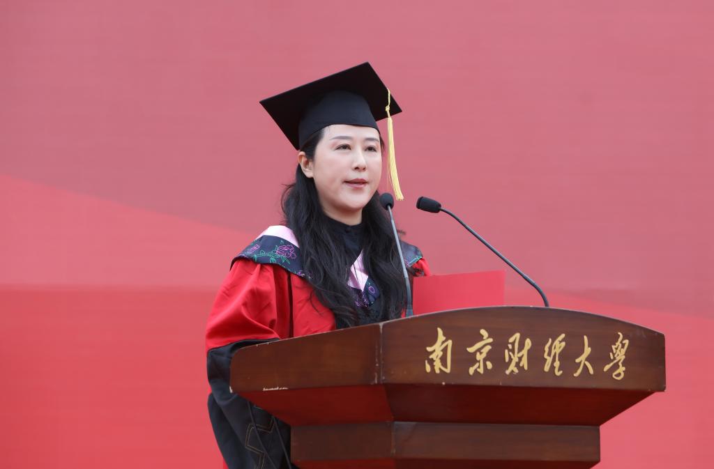 教师代表、金融学院教授童馨乐发言,希望毕业生们不断提升自我,不负青春,不负韶华,保持平常心、甘做寻常事,努力奋斗、厚积薄发,走出铿锵有力的人生;积极承担责任,在新的人生旅途中,成就最美好的自己。