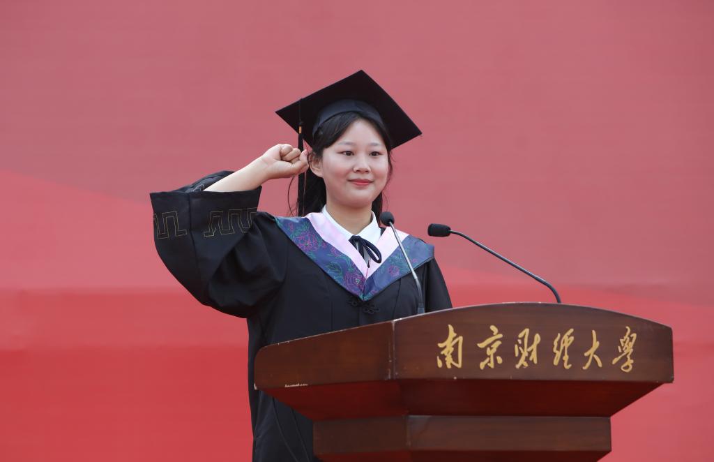 全体毕业生举起右拳,庄严宣誓,铿锵有力的毕业誓词和着激昂的《南财大之歌》,响彻云霄。