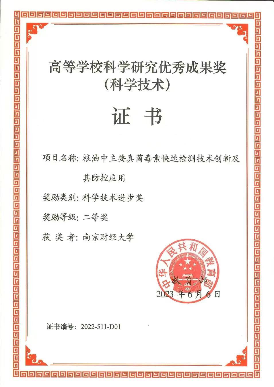 近日,教育部颁发了高等学校科学研究优秀成果奖(科学技术)获奖成果证书,我校食品科学与工程学院方勇教授团队领衔完成的“粮油中主要真菌毒素快速检测及其防控技术创新应用”项目,荣获2022年度教育部高等学校科学研究优秀成果奖科技进步奖二等奖(我校成员:方勇、沈飞、李彭、裴斐、都立辉、邢常瑞)。