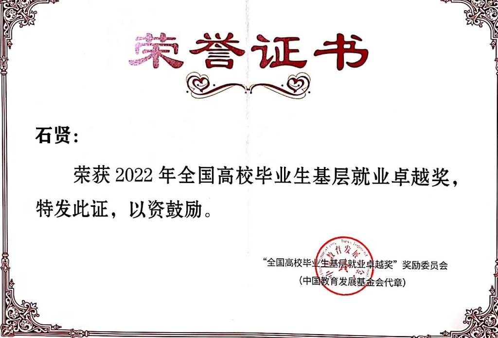 我校毕业生石贤获全国高校毕业生基层就业卓越奖