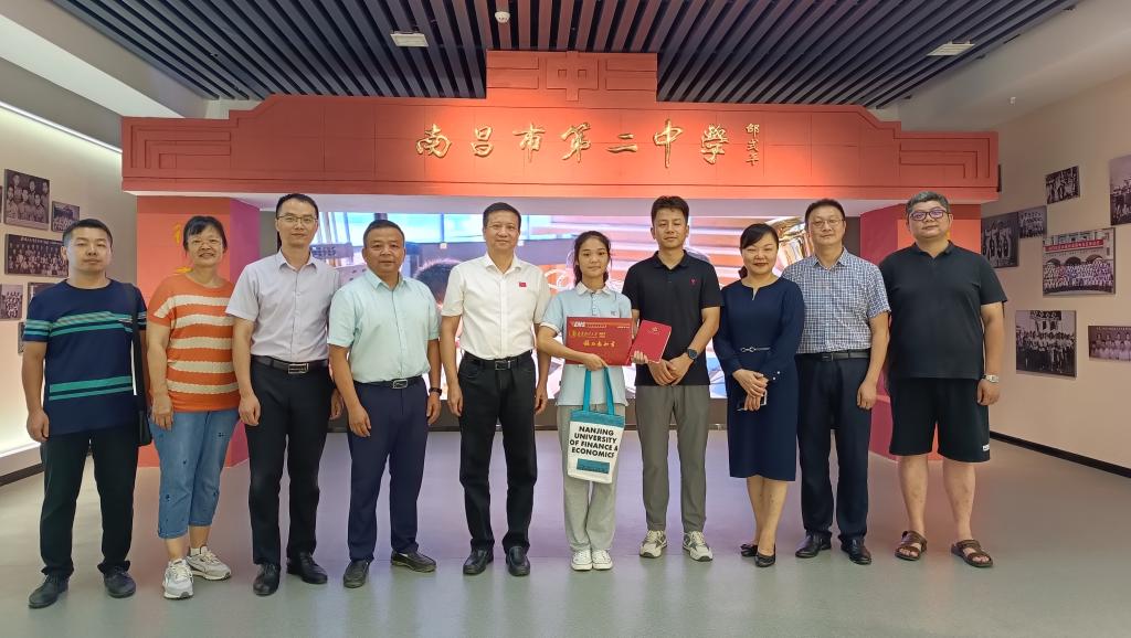 张利民书记一行来到南昌市第二中学调研,了解学校事业发展情况,参观校史馆,并先后为南昌市第二中学汪梦琪、樊伽,九江市第三中学曹逸凡和九江市晨光中学范威四位同学送上录取通知书。“查询到被南京财经大学录取的信息后,我就一直在家里等,没想到书记会亲自送来录取通知书,真是太惊喜了!”汪梦琪同学接过高考录取通知书,难掩激动之情。张利民书记向同学们表示热烈祝贺,向辛勤培育他们的老师和家长们表示衷心感谢。张利民书记详细了解每位同学的家庭情况以及未来的学习规划,认真回答家长和同学们关心的问题。张利民书记介绍了学校的办学特色以及学校近年来所取得的成绩,希望同学们继承和发扬“艰苦奋斗、自强不息、抢抓机遇、敢为人先”的南财精神,与时代共奋斗、与学校共奋斗、与青春共奋斗,成为学校高水平大学建设的亲历者和创造者。张利民书记着重介绍了学校的育人理念和人才培养模式,表示学校将坚持“以学生为本”的理念,始终关注每一位新生学子的发展进步,营造优良的学习生活环境,全力支持同学们成长成才。张利民书记勉励同学们,“少年自有凌云志、不负黄河万古流”,希望大家在新时代新征程中,始终保持昂扬向上的奋进姿态,栉风沐雨、披荆斩棘、勇往直前,以丰富的学识、高尚的品行、过硬的本领、坚定的担当,在中华民族伟大复兴的道路上建功立业。