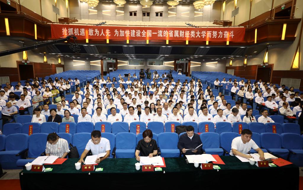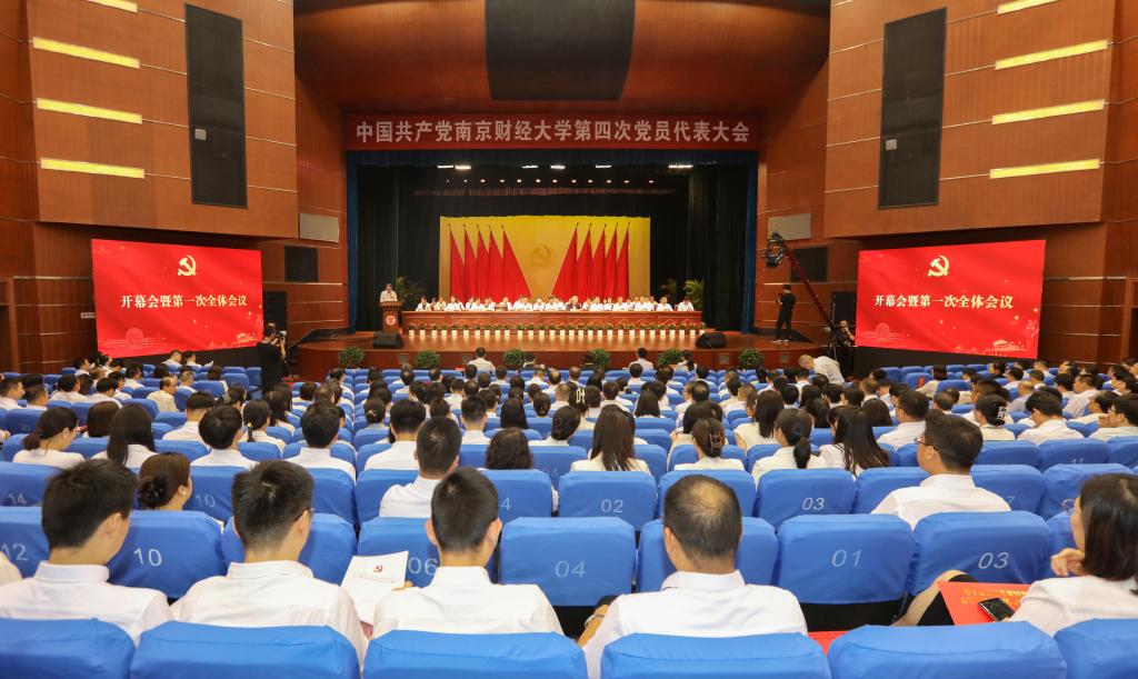 红旗鲜艳,党徽闪耀,仙林校区大礼堂内雄伟庄严、气氛热烈。主席台上方悬挂着“中国共产党南京财经大学第四次党员代表大会”的会标,后幕正中是镰刀和锤头组成的党徽,10面红旗分列两侧,二楼眺台上悬挂着“抢抓机遇 敢为人先 为加快建设全国一流的省属财经类大学而努力奋斗”的横幅。