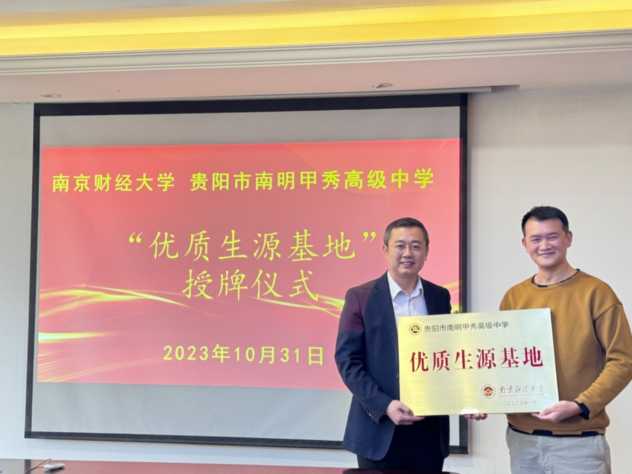 下午,在贵阳南明甲秀高级中学,校长罗婕、副校长王立等人,以及高三学生代表共同参加座谈。我校学生处副处长、招生办公室主任全真真为甲秀中学师生介绍南京财经大学基本情况以及校园文化生活。会计学院副院长李翔教授为学生带来专题讲座“学习、学术与职业发展”,从职业发展以及经济社会需求角度,引导同学们要保持好奇心、认知新世界,现场高三学生热烈讨论、踊跃提问,对我校表现出浓厚的兴趣。现场举办了“南京财经大学优质生源基地签约仪式”,双方代表签约,赵国栋副校长代表学校为贵阳南明甲秀高级中学授牌。