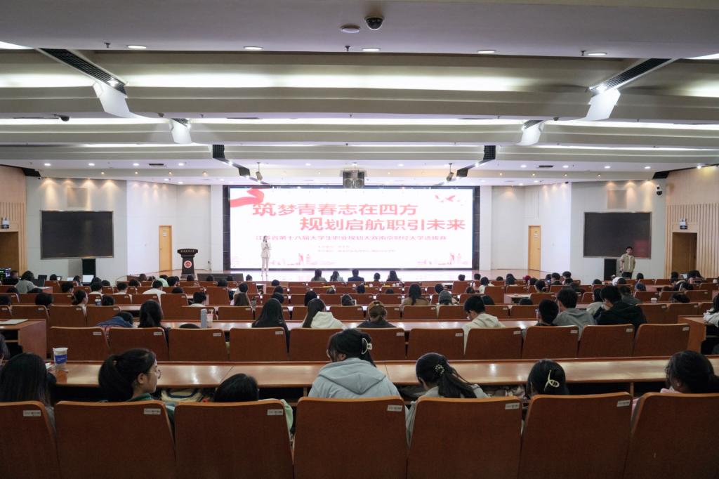 11月8日下午,“农行杯”江苏省第十八届大学生职业规划大赛校内选拔赛决赛在仙林校区图书馆一楼报告厅举办。比赛由学生处主办,大学生就业创业指导中心和国际经贸学院承办。南京邮电大学学生处处长李晓华,南京大学国际关系学院辅导员赵娟,我校校友、国缘V系事业部团购拓展处总经理胡小亮,招商银行零售金融信贷部总经理张海霞,我校法学院副教授、省教育厅招就中心专家库成员甘诺担任大赛评委。党委常委、副校长赵国栋出席活动并为获奖选手颁奖,学生处处长韩力争、会计学院党委书记卜金涛、学生处副处长李慕原、国际经贸学院党委副书记周进进、营销与物流管理学院党委副书记仲巧林和各学院辅导员、师生代表到场观摩比赛。