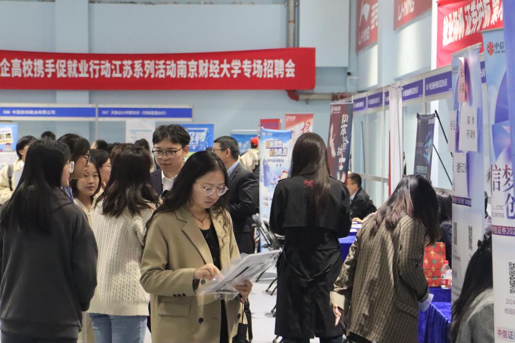 为贯彻落实党中央、国务院关于高校毕业生就业工作的决策部署,保障2024届毕业生高质量充分就业,11月10日下午,江苏省2024届高校毕业生秋季校园招聘月金融、商贸及现代服务业暨“百城万企”民企高校携手促就业行动江苏系列活动专场招聘会在仙林校区体育馆举办。此次招聘会由江苏省教育厅、江苏省人力资源和社会保障厅、江苏省工商联主办,江苏省高校招生就业指导服务中心、江苏省劳动就业管理中心、江苏省职业介绍中心、南京市工商联和我校承办。全国工商联副主席方光华,教育部高校学生司(高校毕业生就业服务司)副司长吴爱华,人力资源社会保障部就业促进司副司长宋鑫,全国工商联社会服务部副部长陆红军,中国人事科学研究院就业创业与政策评价研究室主任庞诗,江苏省委统战部副部长、省工商联党组书记刘军,江苏省委教育工委副书记、省教育厅党组成员潘漫,江苏省人力资源和社会保障厅副厅长张宏伟,我校党委书记张利民,党委常委、副校长赵国栋,江苏省总商会副会长、南京银都奥美广告有限公司董事长张丽出席会议。全国工商联促就业专题调研组同志,省教育厅、省人社厅处室负责同志,省高校招生就业指导服务中心、省人才流动服务中心负责同志现场巡查了招聘会。