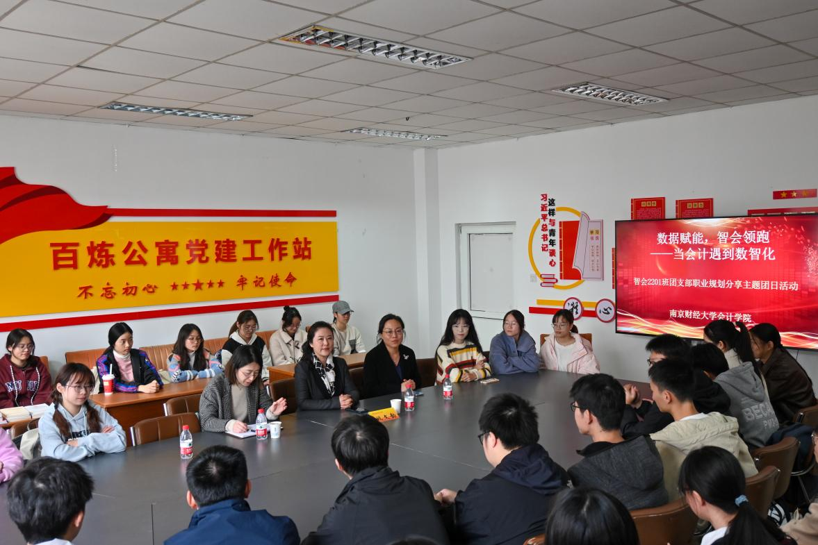 11月23日中午,姚文韵副校长走进学生社区中苑10号站“百炼公寓党建工作站”,参加会计学院智慧会计2201班团支部“数据赋能,智会领跑——当会计遇到数智化”职业规划分享主题团日活动。国际合作与交流处处长杨智华、会计学院党委副书记布丹丹、智慧会计2201班团支部全体学生等参加活动。